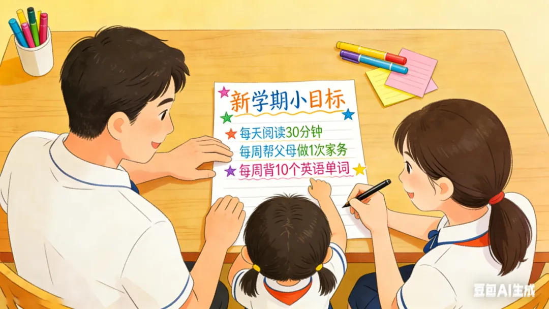 整理假期的收获与成长,和家长一起制定简单可行的新学期小目标,比如认真上好每一堂课、坚持每日阅读、主动结交新朋友等。带着明确的方向和美好的期待,以饱满的热情开启校园新旅程。