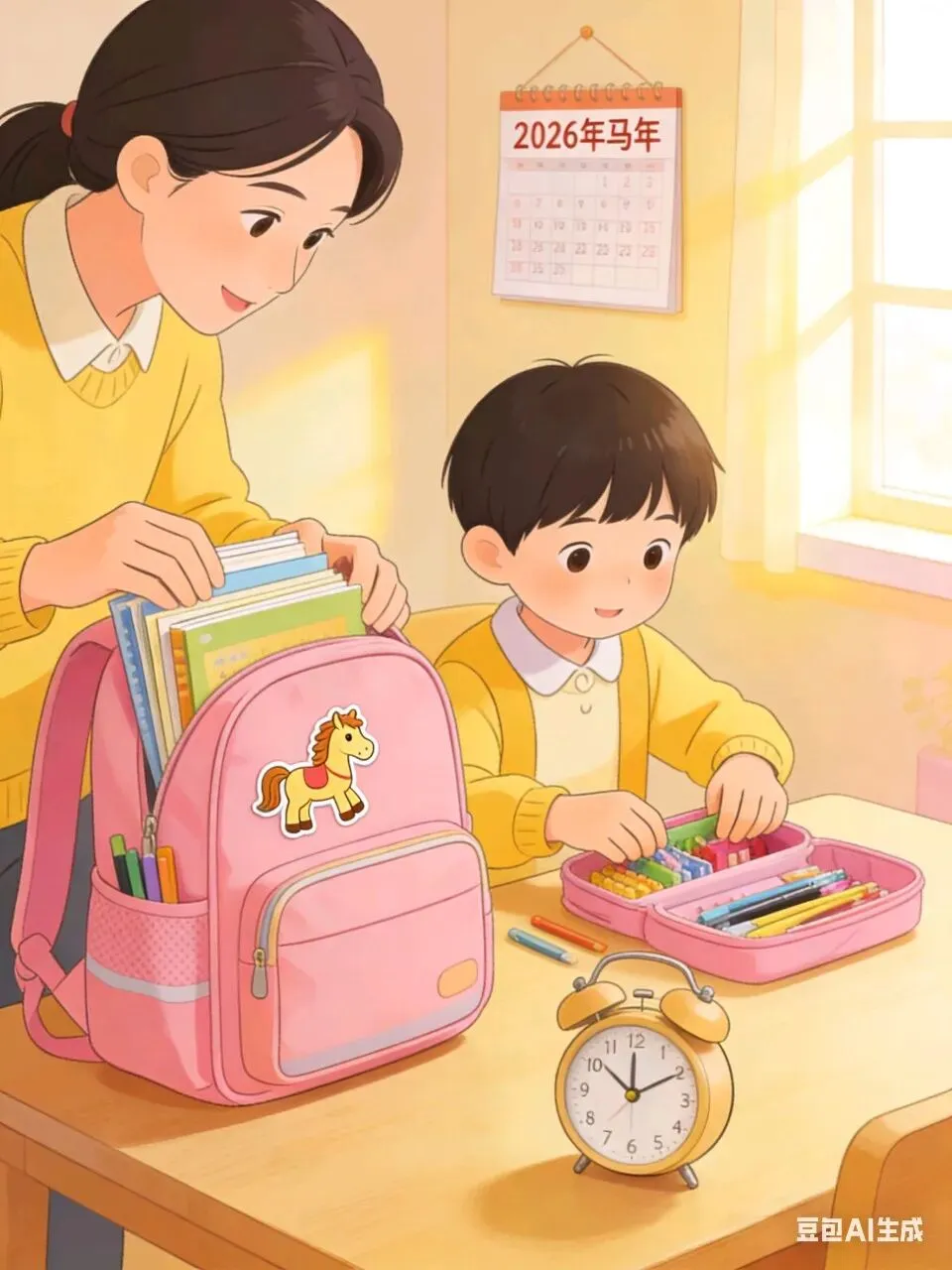 和孩子一起调整生活作息,减少娱乐活动,营造安静的学习氛围,陪孩子整理书包、准备学习用品,用仪式感让孩子感受到开学的庄重与美好,平稳完成假期到开学的过渡。
