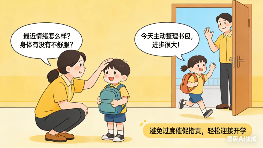 面对孩子的开学焦虑,不指责、不催促,放下手头的忙碌,耐心倾听孩子的心声,理解他们的不安与期待。用温暖的话语给予安慰和鼓励,让孩子感受到被理解、被关爱,消解内心的焦虑。