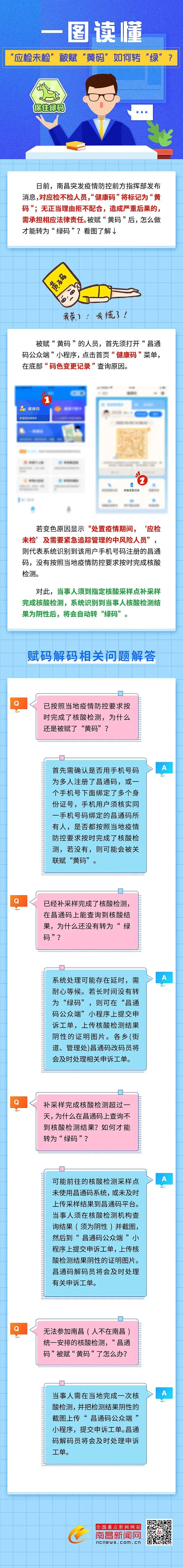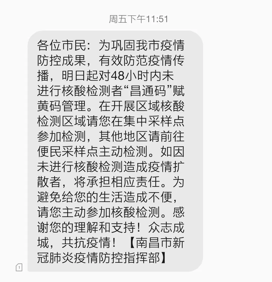 各位市民:为巩固我市疫情防控成果,有效防范疫情传播,明日起对48小时内未进行核酸检测者“昌通码”赋黄码管理。在开展区域核酸检测区域请您在集中采样点参加检测,其他地区请前往便民采样点主动检测。如因未进行核酸检测造成疫情扩散者,将承担相应责任。为避免给您的生活造成不便,请您主动参加核酸检测。感谢您的理解和支持!众志成城,共抗疫情!【南昌市新冠肺炎疫情防控指挥部】