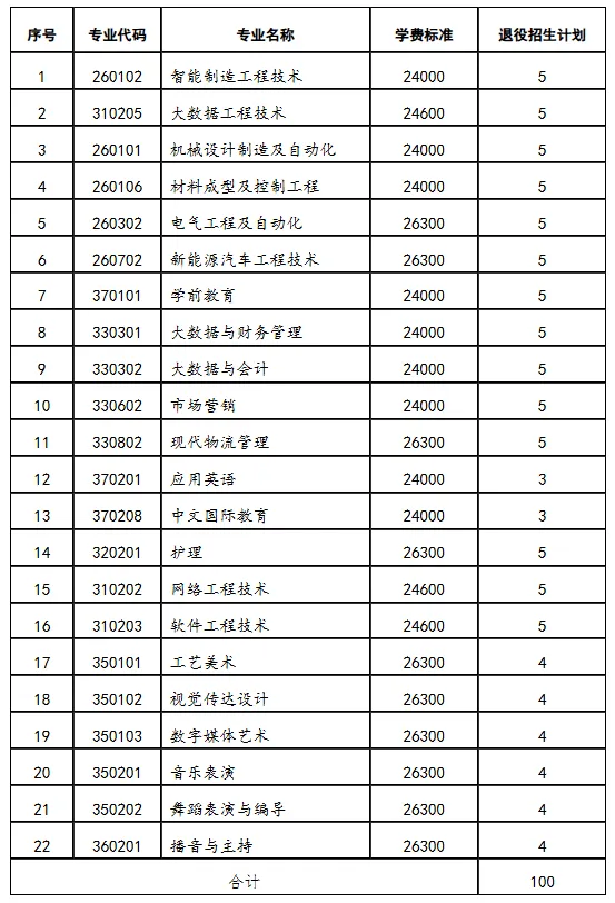 我校2026年专升本免试退役大学生士兵招生计划100名。