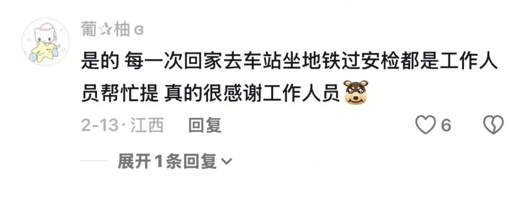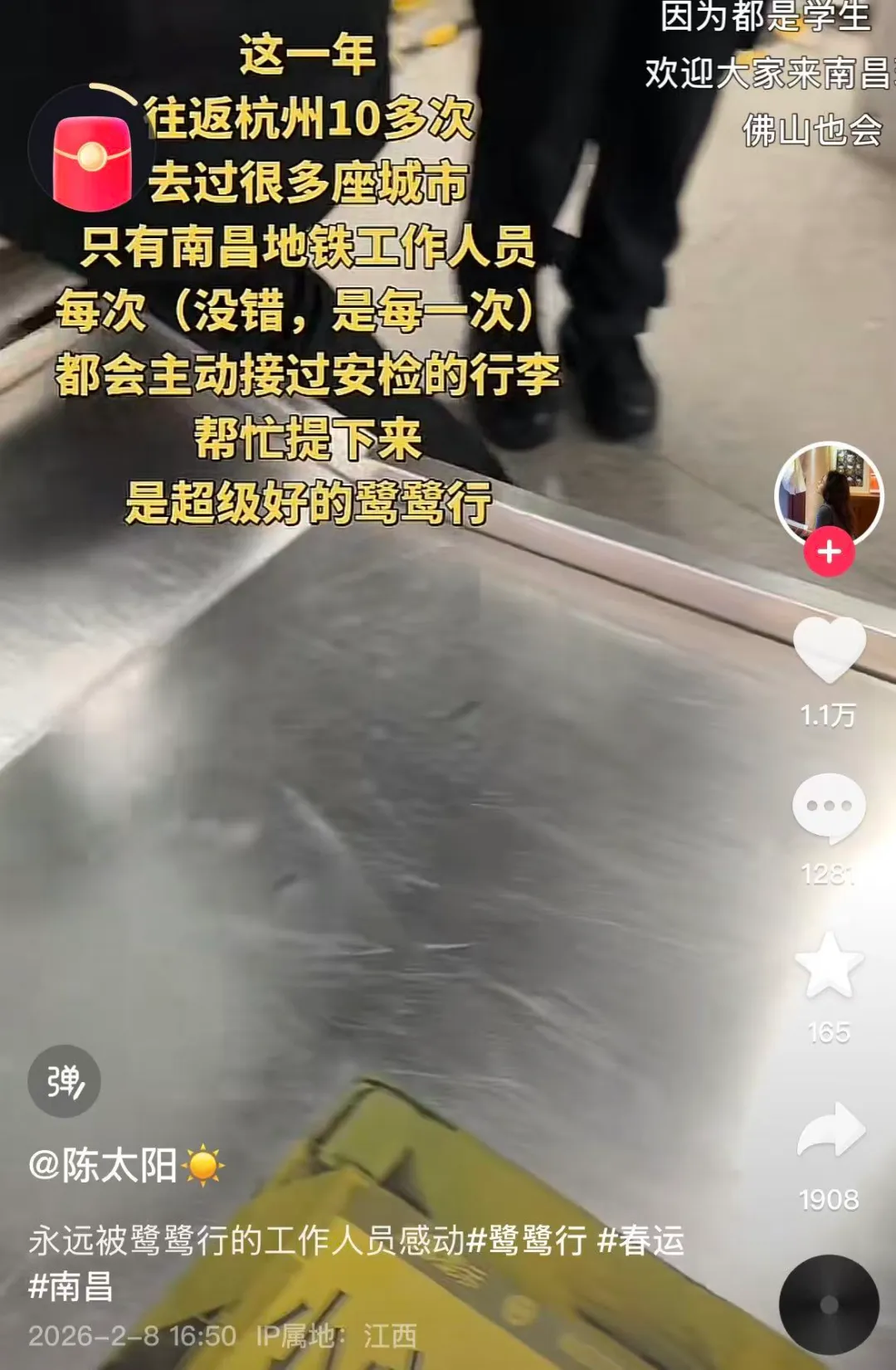 网友@陈太阳在账号发布:“这一年去过很多城市,只有南昌地铁工作人员每次(没错,是每一次),都会主动接过安检的行李,帮忙提下来。”