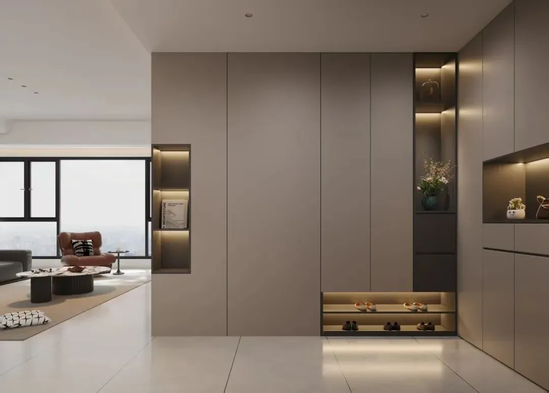 入户第一眼就被定制鞋柜惊艳,一体化柜体与墙面无缝衔接,浅灰调高级耐看。嵌入式灯带勾勒出精致轮廓,底部留空设计搭配灯光,解决鞋子收纳的同时,让入户动线更清爽。