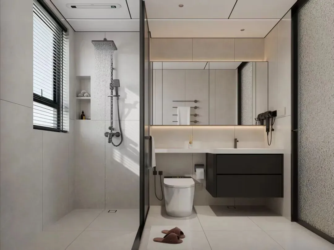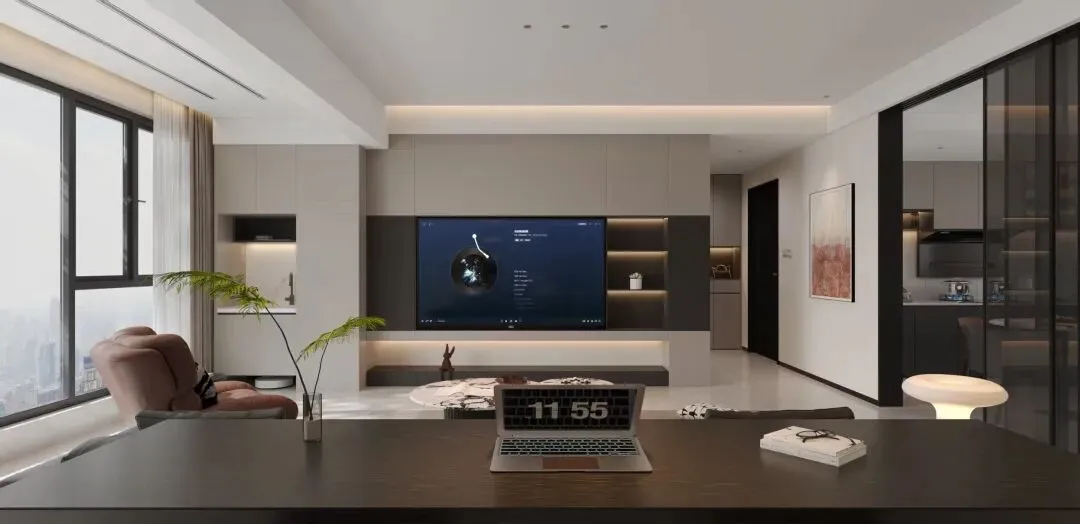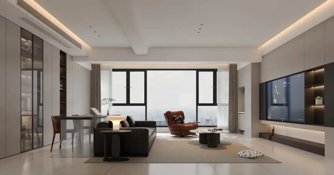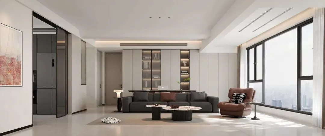 客餐厅LDK一体化设计,是整个家的核心亮点。沙发背景柜采用玻璃与板材拼接,藏露结合,摆放藏品与书籍,氛围感拉满。电视背景墙简洁大气,悬浮式柜体搭配线性灯,与整体风格呼应。超大落地窗引入充足光线,站在客厅就能俯瞰城市风景,空间通透感直接拉满。