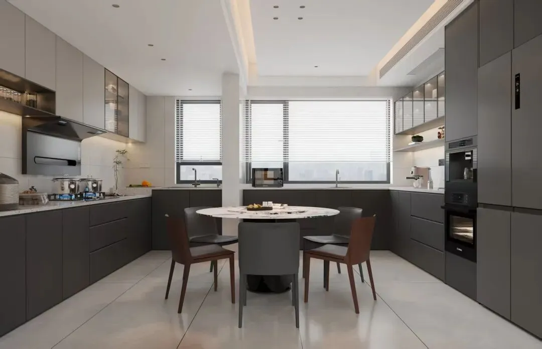 餐厨区打破传统隔断,形成流畅的生活动线。深灰橱柜耐脏又有质感,搭配圆形餐桌,亲朋好友小聚也能从容应对,烟火气与仪式感兼得。