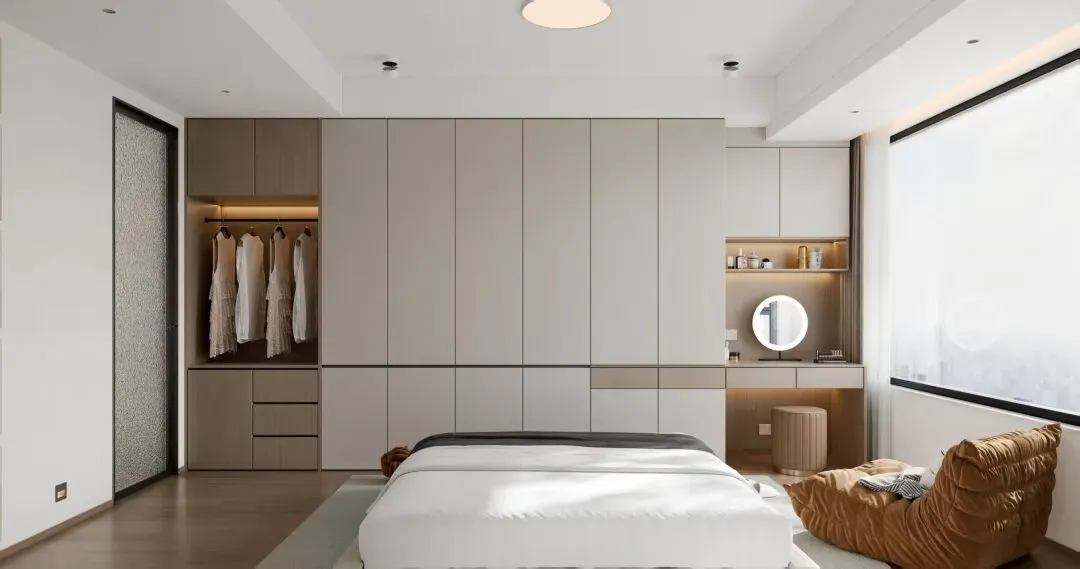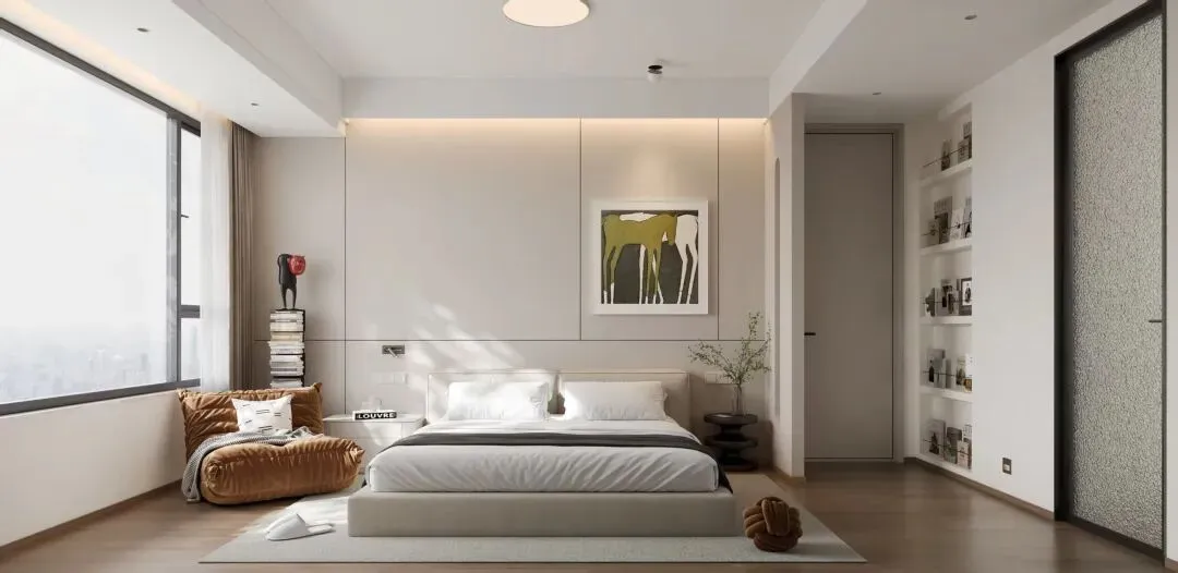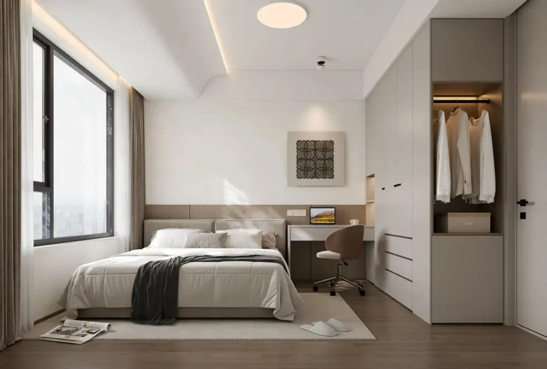 卧室延续整体简约调性,主卧床头背景墙采用硬包拼接,温柔又高级。床尾柜与梳妆台一体化设计,最大化利用空间,满足女主人的收纳与梳妆需求。次卧简洁实用,定制柜体兼顾衣物收纳与学习功能。