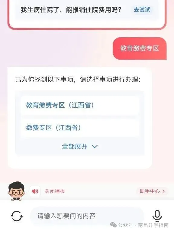 2.首页点击小赣事,选择服务查询助手,语音或文字输入教育缴费专区。