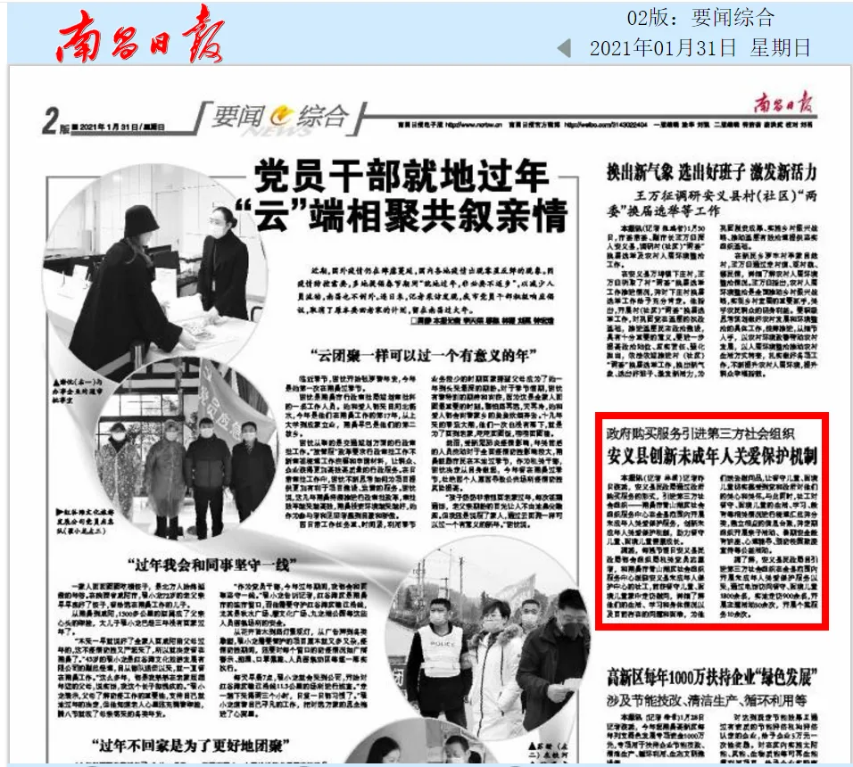 1月31日,南昌日报以《安义县创新未成年人关爱保护机制》为题,报道我县通过政府购买服务的形式,引进第三方社会组织在全县范围内开展未成年人关爱保护服务,创新未成年人关爱保护机制,助力留守儿童、困境儿童健康成长进行宣传报道。