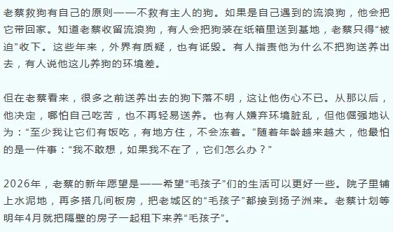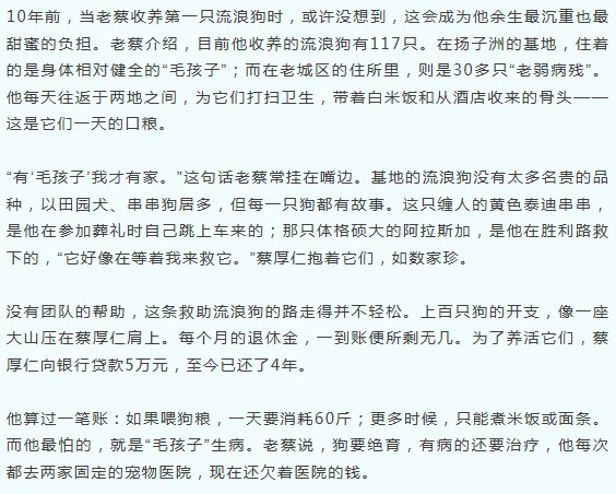老蔡原名蔡厚仁,今年65岁。在朋友戴先生眼里,老蔡是个善良的人,他把所有精力都花在这些流浪狗身上。