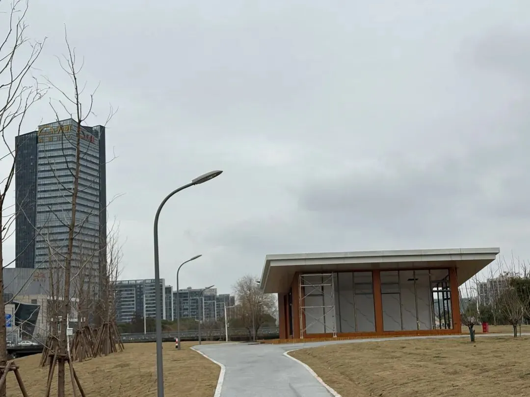 在水系边铺设了鹅卵石,人可以直接接触水面,这到夏天应该会成为新的打卡地。桃花河二期,设置游船码头5处,二期绿道长度的6.9公里。二期桥下绿道现已全面贯通,对于居民休闲将更加便利。二期驿站11处,新增驿站6处,整体桃花河沿线停车场10处,共计455个停车位,九洲高架桥下停车场3处,停车位数量共计218个。植被从以前的杂草丛生变成以桃花为主的湿地公园,布局了菊花桃,色碧桃,酒金碧桃, 红花碧桃等。 桃花河湿地公园串联九洲高架桥下空间,桥下空间长度857m,总面积约5.0公顷,桥下运动区域2公顷,篮球场跑道1600米,游步道长度300米。设置各类运动场地出,户外健身房,匹立球,休闲广场,儿童活动区等),激发演羽毛球场,门球等。有一说一整个湿地公园公厕是真多,200.300米就是公厕,这配置简直太人性化。整体对比效果图有差距,对于两岸居民休闲观光还是不错的,也大大提升周边城市界面。