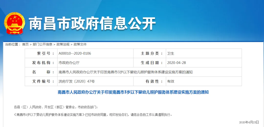 《方案》要求,2020年,在2019年完成5家婴幼儿照护服务机构建设试点的基础上,实现我市对婴幼儿照护服务的标准化、规范化管理,健全政策联动机制,逐步建立形式多样的婴幼儿照护服务模式。新建、改扩建至少35所婴幼儿照护服务机构(其中:普惠性机构在50%以上),并争创2-3所省级婴幼儿照护服务示范机构。