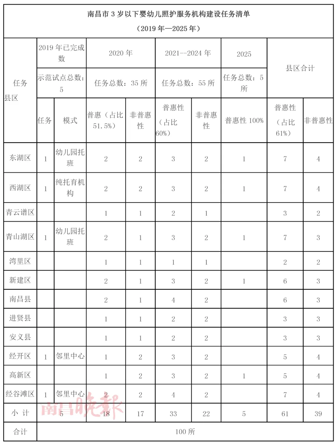 到2025年,全市至少累计完成100家婴幼儿照护服务机构建设,普惠性覆盖进一步扩大,政策法规体系进一步完善,婴幼儿照护服务资源配置基本合理,支持婴幼儿照护服务社会环境和服务体系不断优化,规范化、多层次、多样化、可选择、覆盖城乡的婴幼儿照护服务体系基本形成,婴幼儿照护服务水平明显提升,人民群众的婴幼儿照护服务需求得到进一步满足。