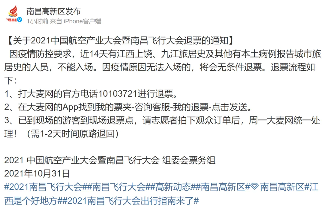 10月30日至31日,我省上饶市铅山县、九江市柴桑区报告各有一名新冠病毒核酸检测阳性人员。为切实加强2021南昌飞行大会疫情防控工作,阻断疫情传播风险,保障广大市民的健康安全,现通告如下: