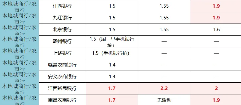 不想存长期的朋友看这里!华夏银行1年期1.55%,江西裕民银行、南昌农商银行1年期均达1.7%,赣州银行、上饶银行1年期也有1.5%(手机银行抢额度),短期闲钱也能赚高息。加上抢到额度,购物卡折现可到一年1.8%可选薅福利:九江银行新客T+1日,7个工作日后兑换。R2风险(中低风险理财)。50元微信立减金。