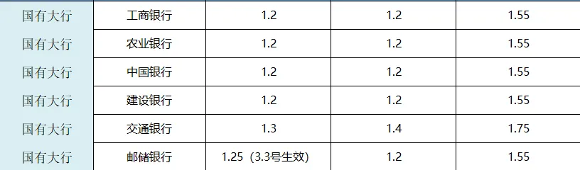 安全性选手主打选择的银行,四大行(工行、农行、中行、建行)+邮储银行+交通银行,3年期利率统一为1.55%,1、2年期均为1.2%,利率虽不高,但胜在网点多、安全性高,适合偏爱国有行的储户。1年期利率亮点