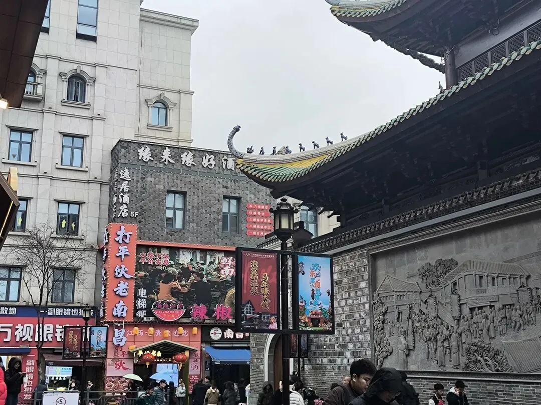 贺龙是南昌起义的总指挥,他在共产党危难时期“不要高官厚禄,只要跟党走”,打响了第一枪,他是革命洪流中的一柄斩断枷锁的“菜刀”,他从未踏足高等学府,却用“菜刀”和“忠诚”在战场上写就了最硬的毕业证,是我生后辈之楷模。 第二站,我们来到了“万寿宫”。薄雾如纱,万寿宫的屋檐在江风中若隐若现。南昌铁柱万寿宫是根,“铁柱镇洪州,万年永不收”,也是我们江西人“行走的故乡”。走着走着,到了广润门,一扇大门敞开,下方还有一个大铃铛。广润门是各地千帆万船卸货的聚集地,是南昌老城“七门九洲十八坡”中最富、最闹、最江湖的那一扇门。它没有滕王阁的文人雅气,只有青石板、麻石路、挑夫脚力的粗粝感。 万寿宫文化街区上的人来人往,生气勃勃令我陶醉,好像人们早已忘记天色灰蒙,下了点蛛丝雨,丝毫不影响自己对文化的吸取,它让你走在百年的街巷里,呼吸着2026年的风。天空中的灰色与烟火气、青石板融在了一起,仿佛在叙说江西南昌的故事。随即,我们有点饿了,我们在街巷中找了一家螺蛳粉店坐了下来,一边品尝着刚出锅的螺蛳粉,一边听着在碗筷轻碰间流通的言语,真是美哉。 伴随着时间流逝,我们走着来到了街区的心脏,香火鼎盛的万寿宫,许真君的塑像俯瞰众生,有年轻的父母带着孩童,教他们稚拙地作揖,将姓氏籍贯报与神明,仿佛完成在完成一场认祖归宗的启蒙,也有人求“家门清吉,人畜平安”,这是香火的延续,也是文化的传承。 “落霞与孤鹜齐飞,秋水共长天一色”,描述的大南昌的滕王阁,滕王阁矗立于赣江之滨,如一卷被岁月缓缓展开的盛唐手卷。它不仅是“江南三大名楼”之一,更是一具用木石写就的千年骨骼。因为我们没有很多时间了,我们只能在滕王阁外一观,其九重飞檐如大鹏垂天之翼,很是壮观。 时间不等人,匆匆流过。尽管不舍得走,但我们得回去了,在南昌玩了一天,感觉像是同时闯入了一部热血史书和一碗沸腾的瓦罐汤,这座城市把英雄气与烟火气都炖的滚烫。这里是活的!香火气和辣椒味在巷子里打架,小孩在喧哗,老人们在洽谈,年轻女生们照照镜子看看妆花了没,男生则是背着挎包大步向前。南昌适合打卡,更适合“沉浸”,欢迎来到我们的南昌——这座英雄之城,也是一座充满活力的城市。