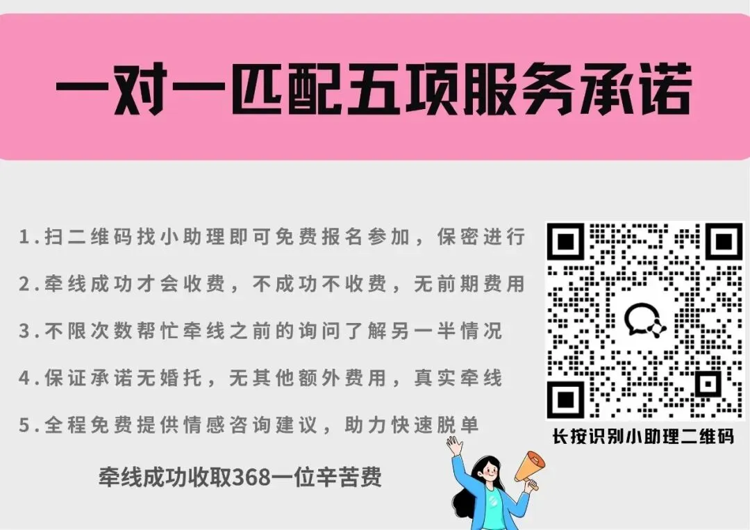 小助理会根据您的要求结合自身情况主动帮您从单身人士资源库中人工筛选出匹配度最高的小伙伴做成资料卡片发送给您查看,您觉得满意以后再去问对方的意愿,牵线前做到清楚了解对方的个人情况,在小助理的撮合协商转达告知下,双方都有意愿进一步认识再安排牵线,牵线前双方资料+照片互换,尊重彼此意愿,有基础的进行相亲认识,不耽误大家时间。