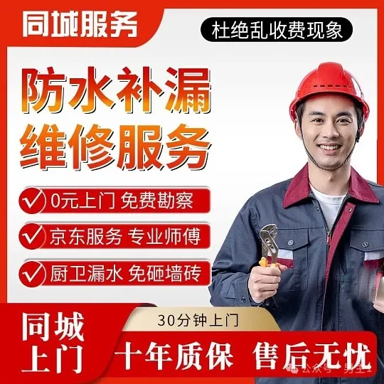 卫生间漏水治理:解决地面渗水、墙面返潮、阴角开裂、下水管周边漏水厨房防水维修:处理橱柜底部积水、洗菜盆周边渗漏、水管连接处漏水阳台防水补漏:修复地漏周边渗水、推拉门下方进水、外墙雨水内渗天花板与墙面:修复楼上漏水导致的损害,处理自家顶面冷凝水潮湿外墙防水维修:修复墙面裂缝、瓷砖空鼓渗水、窗户四周漏水、结构缝渗漏屋顶全面补漏:平顶 / 斜顶渗漏治理、瓦片修复更换、防水层整体重做地下室防潮防水:墙面防潮处理、地面返水堵漏、结构缝及套管密封飘窗与露台:解决接缝处渗水、排水口堵塞、防水层老化失效问题2、快速派单系统智能匹配 300 米内专业防水师傅3、上门勘察2 小时内到达,使用仪器检测,精准定位渗漏源4、方案报价提供书面维修方案与透明价格明细,签约后施工1、检测设备红外热成像仪、湿度检测仪、打压测试设备、内窥镜 ✨2、核心材料高分子防水涂料、自粘防水卷材、快速堵漏剂、结构密封胶3、特色工艺高压注浆加固、背水面防水、整体涂膜防水、节点增强处理4、保障标准严格按国家标准施工,保修期内提供免费维护1、时效保障紧急漏水 10 分钟响应,300 米内优先派单,快速上门 ✨2、质量保障材料环保达标,提供检测报告;施工标准化,环节可验收3、价格保障免费上门检测报价,费用明细清晰,无任何隐形增项4、售后保障局部维修保修 2 年,整体防水保修 5 年;定期回访,建立维修档案