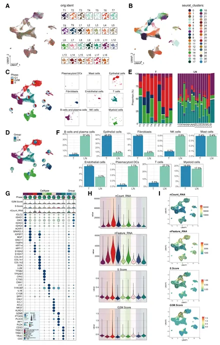我们对 9 名未接受过治疗的新诊断 ESCC 患者的 27 份样本(肿瘤组织及配对淋巴结)进行 scRNA 测序,经质控后保留 121,038 个高质量细胞,识别出 36 个细胞簇并归类为 9 种细胞类型(B 细胞和浆细胞、内皮细胞等)。不同患者及同一患者不同部位的细胞分布异质性显著,肿瘤组织中上皮细胞占比最高且增殖活性最强,其次是髓系细胞,淋巴结中 B 细胞、T 细胞等免疫细胞浸润更丰富。