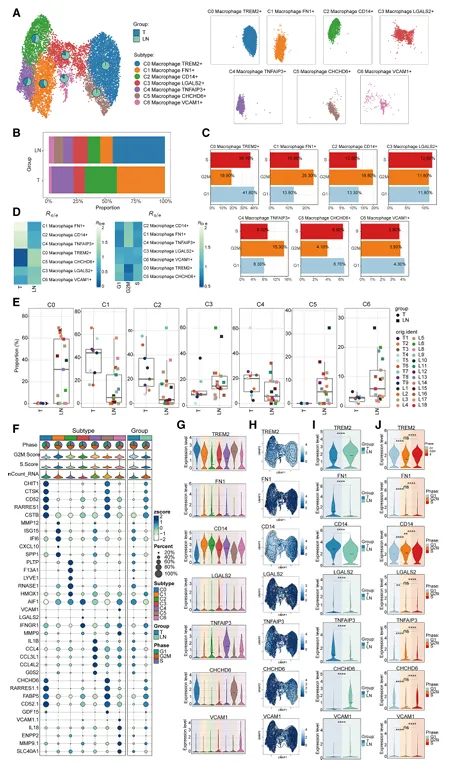 肿瘤相关巨噬细胞(TAMs)是 ESCC 微环境中最丰富的免疫细胞,降维聚类将其分为 7 个亚型(C0 TREM2⁺、C1 FN1⁺等),分布异质性显著。其中 C0 TREM2⁺巨噬细胞源自淋巴结(G1/S 期),C1 FN1⁺巨噬细胞多见于活跃增殖的肿瘤组织(G2M/S 期),C2 CD14⁺、C4 TNFAIP3⁺巨噬细胞主要来自肿瘤组织,C3 LGALS2⁺、C6 VCAM1⁺巨噬细胞源自转移相关淋巴结;各亚型有独特特征基因表达模式,与样本分布及细胞周期阶段一致。