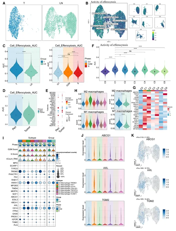肿瘤免疫功能与 TAMs 胞葬活性密切相关,原发肿瘤组织中 TAMs 的胞葬活性显著高于淋巴结及正常组织,提示原发灶免疫抑制更强,胞葬作用或为 ESCC 治疗靶点。TAM 亚型中 C1 FN1⁺巨噬细胞胞葬活性最高,处于 M1-M2 过渡状态,其相关基因(ABCG1、AXL 等)调控凋亡与脂质代谢,与胞葬作用相关;体外实验证实,巴维昔单抗可降低巨噬细胞胞葬活性。