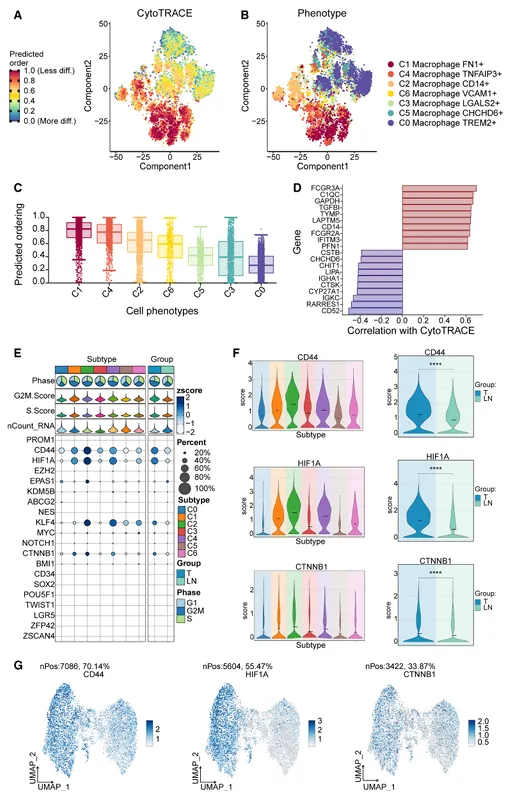 通过轨迹分析与 CytoTRACE 评估发现,C1 FN1⁺巨噬细胞的细胞干性最高,分化程度最低、分化潜力较强,其干性特征可能与 FCGR3A、C1QC 等免疫相关基因的正相关表达有关。