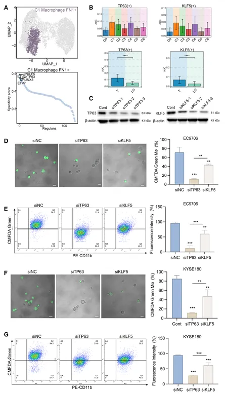 通过 SCENIC 分析解析 C1 FN1⁺巨噬细胞调控网络,发现调控子活性是 TAM 亚型分类的关键,不同亚型间差异显著。C1 FN1⁺巨噬细胞的五大关键调控因子中,TP63 和 KLF5 在区分 TAM 亚型与组别时显著性最高、AUC 更突出,其中 TP63 是调控该亚型致癌机制及 TAM 生物功能的核心驱动因素。
