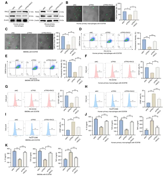 体外实验验证,RAC2 是 TP63 的下游调控因子:过表达 RAC2 可恢复 TP63 缺失巨噬细胞中的 RAC2 表达,并挽救其对凋亡 EC9706 细胞的吞噬能力。TP63 敲低会减少 M2 巨噬细胞(F4/80⁺CD163⁺)、增加 M1 巨噬细胞(F4/80⁺CD86⁺),且下调 M2 标志物 IL-10、TGF-β,上调 M1 标志物 TNF-α,而 RAC2 过表达可逆转这些表型变化,表明 TP63 通过调控 RAC2 介导巨噬细胞 M2 极化。
