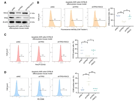 2体外实验:通过 siRNA 敲低 TP63、RAC2,或过表达 RAC2,结合共培养、流式细胞术、免疫荧光等验证巨噬细胞胞葬活性与极化表型;