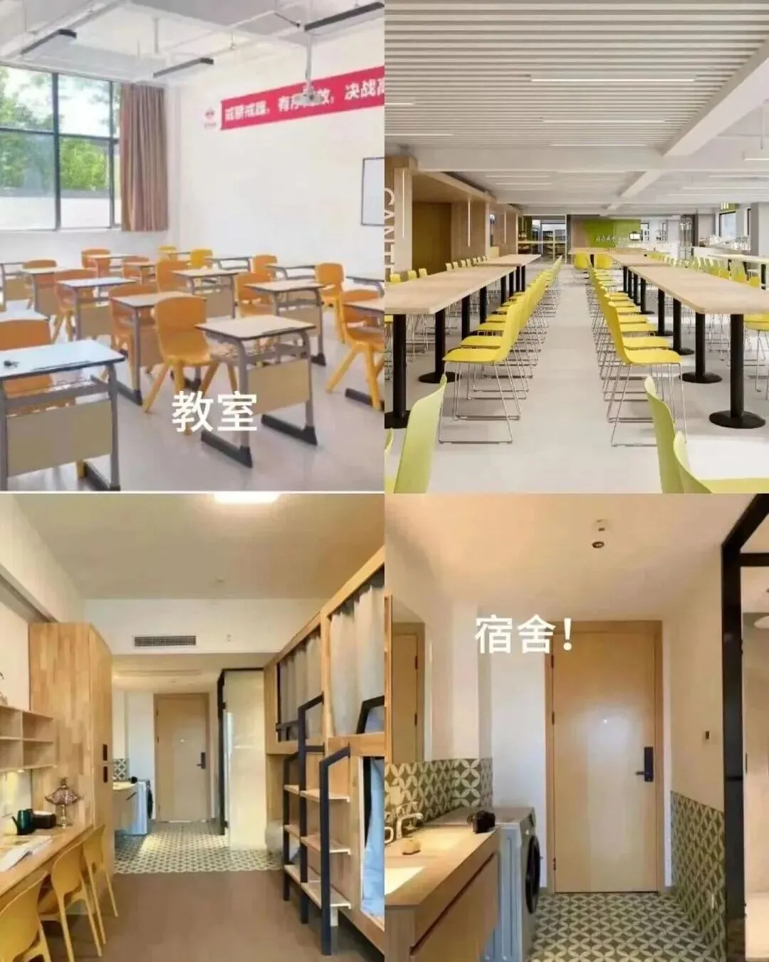 ✅寝室:标准4人间,配备上床下桌,独立储物柜、空调、卫浴;设立公共洗衣房、热水供应,公共区域提供吹风机;智能门禁系统,定期卫生检查,举办“文明宿舍”评比活动。