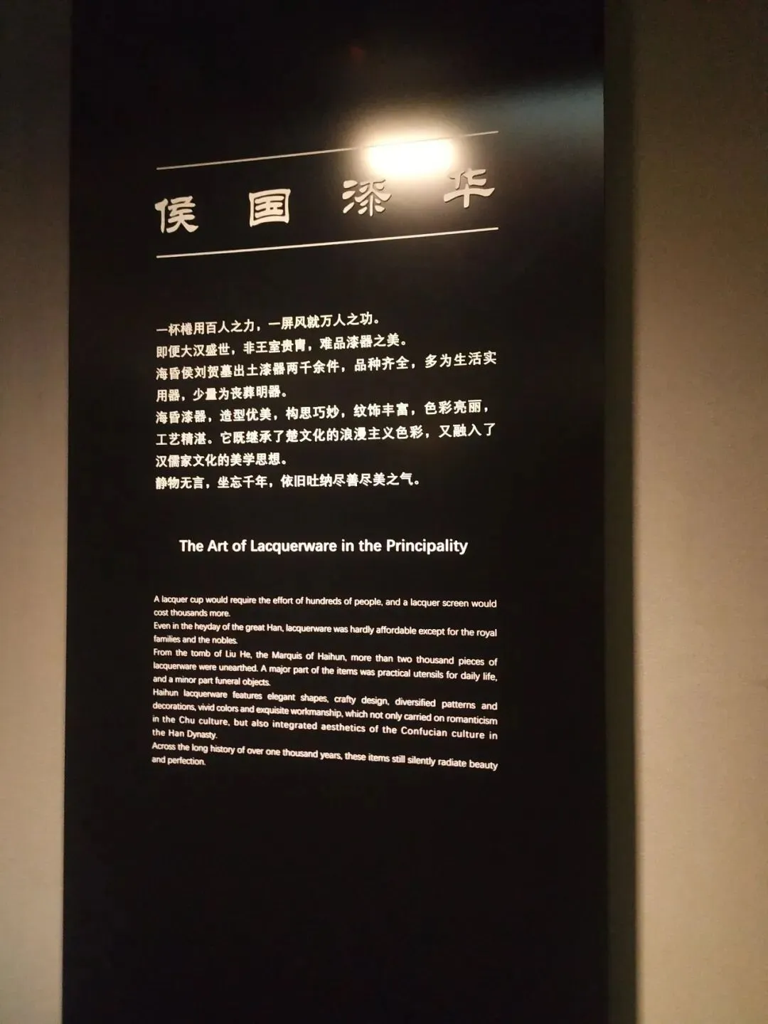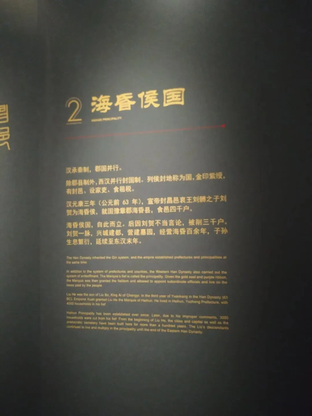 博物馆为国家一级博物馆,常设“金色海昏”、“书香海昏”、“丹漆海昏”、“遇见海昏”四大展厅,展陈文物1200余件(套),涵盖金器、玉器、青铜器、漆木器、简牍等,品类之丰、工艺之精、等级之高,堪称西汉王侯墓考古之最。