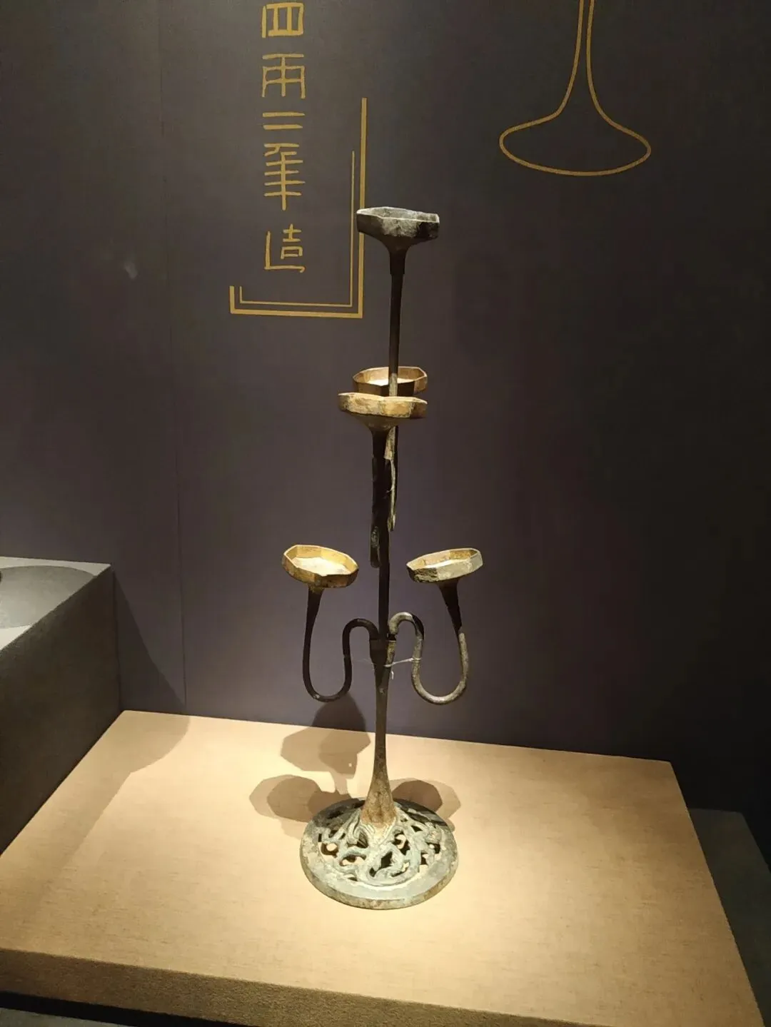 五连枝青铜灯通体鎏金,树形灯柱分五枝,承托灯盘,灯座镂空雕龙纹,点亮时灯火错落,如星辰垂落,奢华至极。