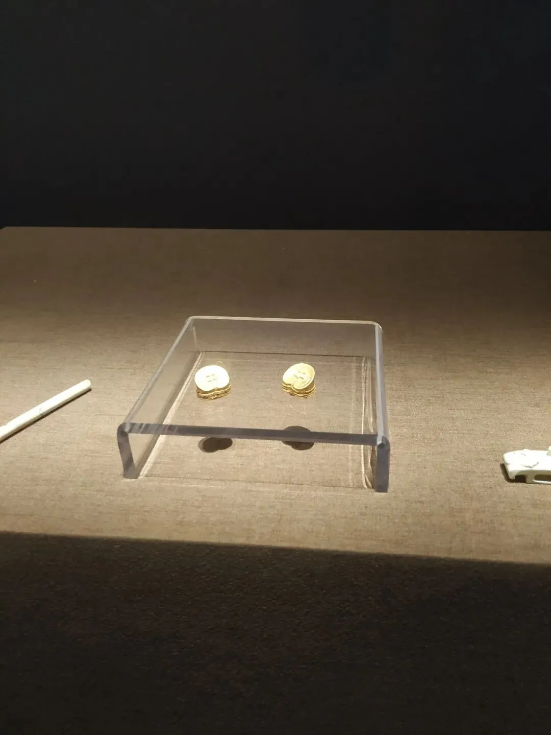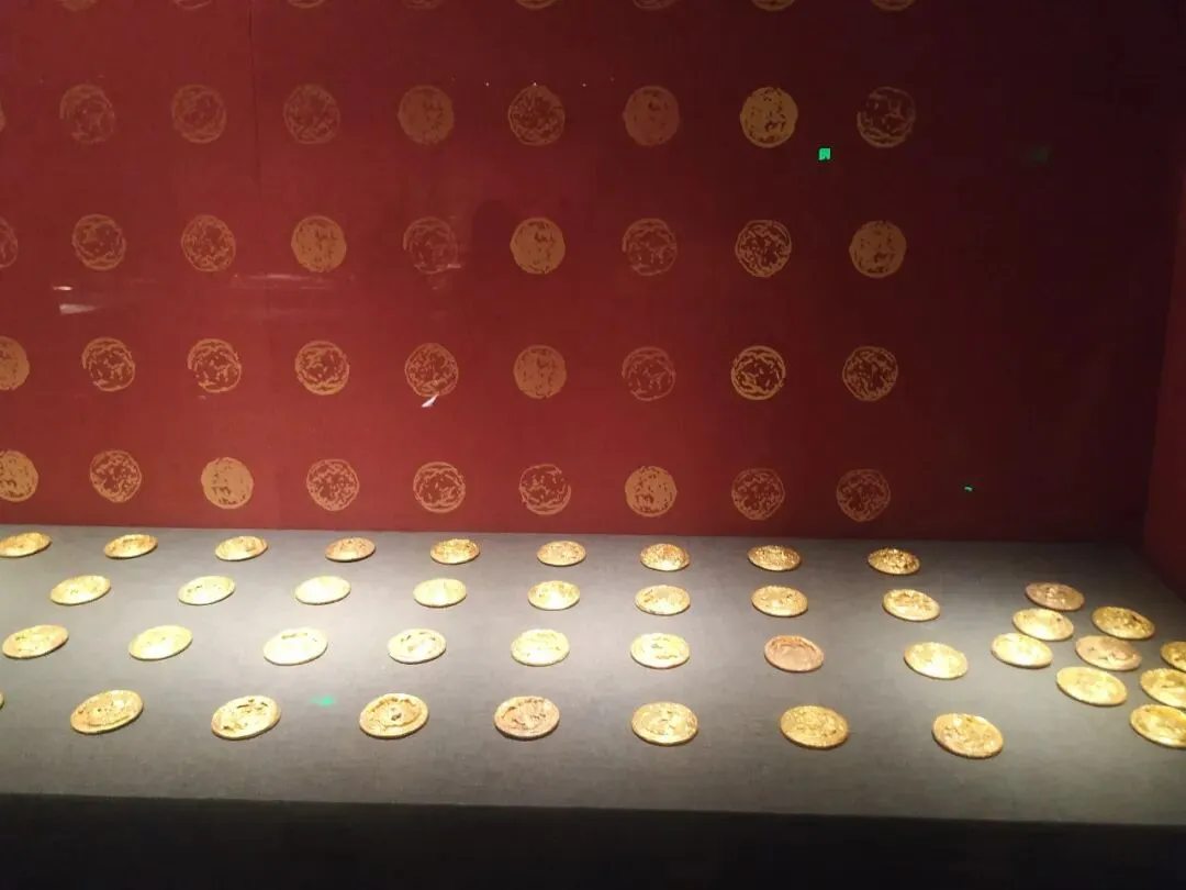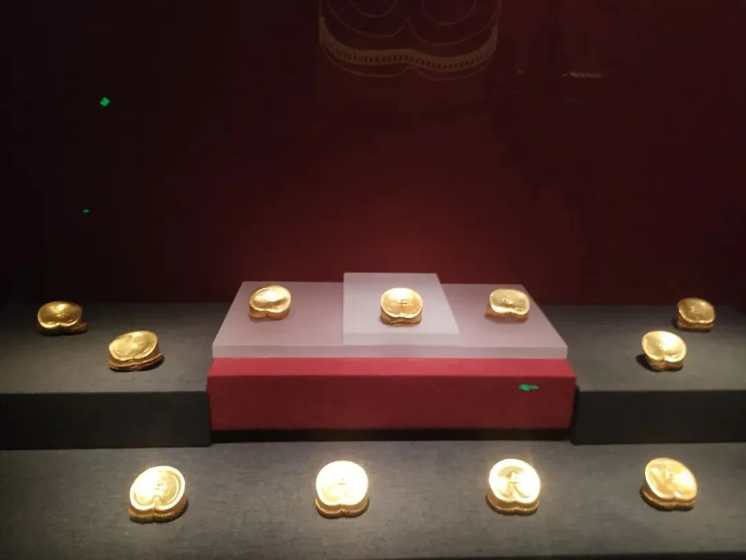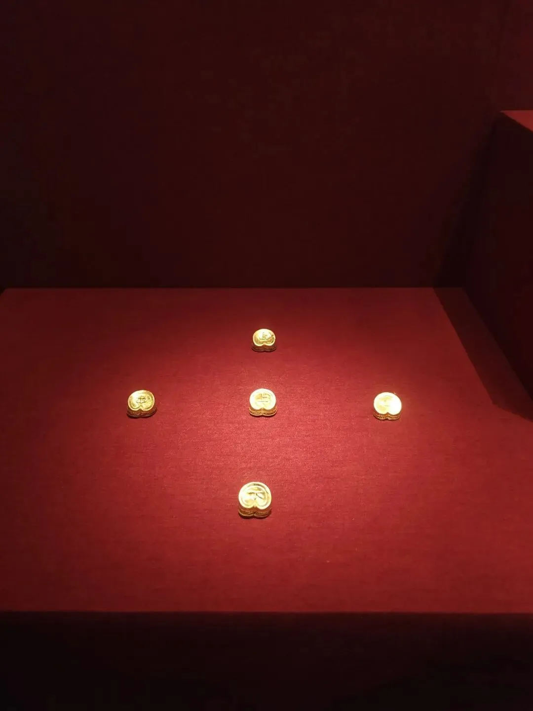 385枚金饼堆叠成“金小山”,圆浑厚重,表面刻有铭文、符号,是汉代黄金货币的核心形制,用于祭祀、赏赐与储备。48枚马蹄金与25枚麟趾金更是工艺巅峰,马蹄金呈马蹄形,内壁镶嵌琉璃,外壁錾刻云纹、龙纹,麟趾金形似瑞兽脚趾,二者为汉武帝为纪念“渥洼马出、麟趾呈祥”而制,是王侯级别的祥瑞礼器,非流通货币,象征皇权与恩宠。
