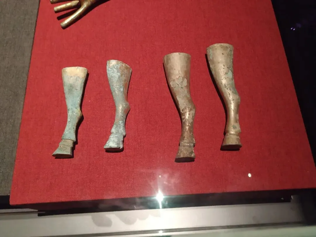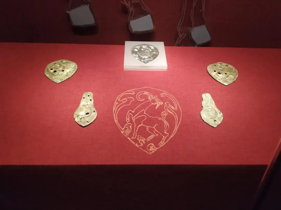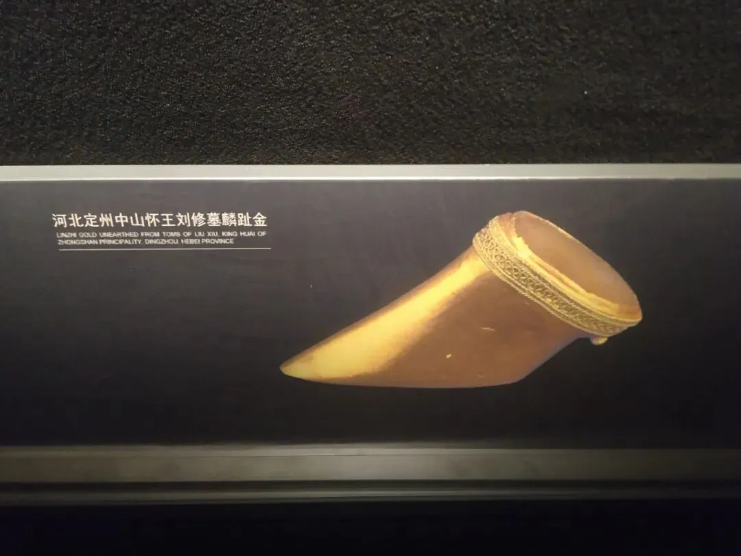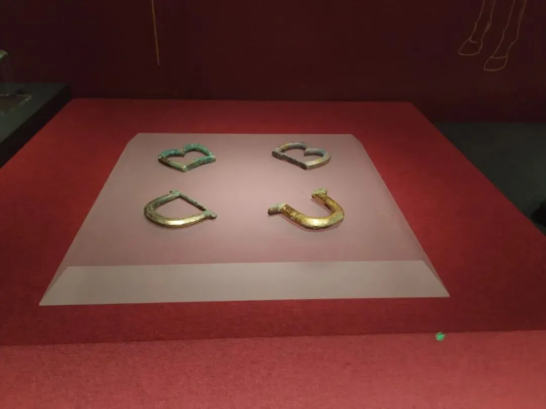 385枚金饼堆叠成“金小山”,圆浑厚重,表面刻有铭文、符号,是汉代黄金货币的核心形制,用于祭祀、赏赐与储备。48枚马蹄金与25枚麟趾金更是工艺巅峰,马蹄金呈马蹄形,内壁镶嵌琉璃,外壁錾刻云纹、龙纹,麟趾金形似瑞兽脚趾,二者为汉武帝为纪念“渥洼马出、麟趾呈祥”而制,是王侯级别的祥瑞礼器,非流通货币,象征皇权与恩宠。
