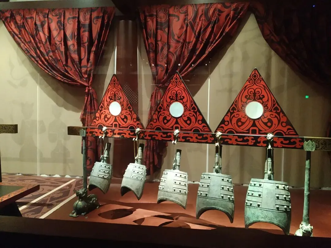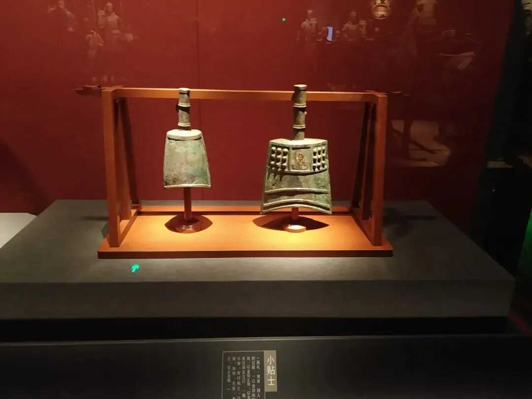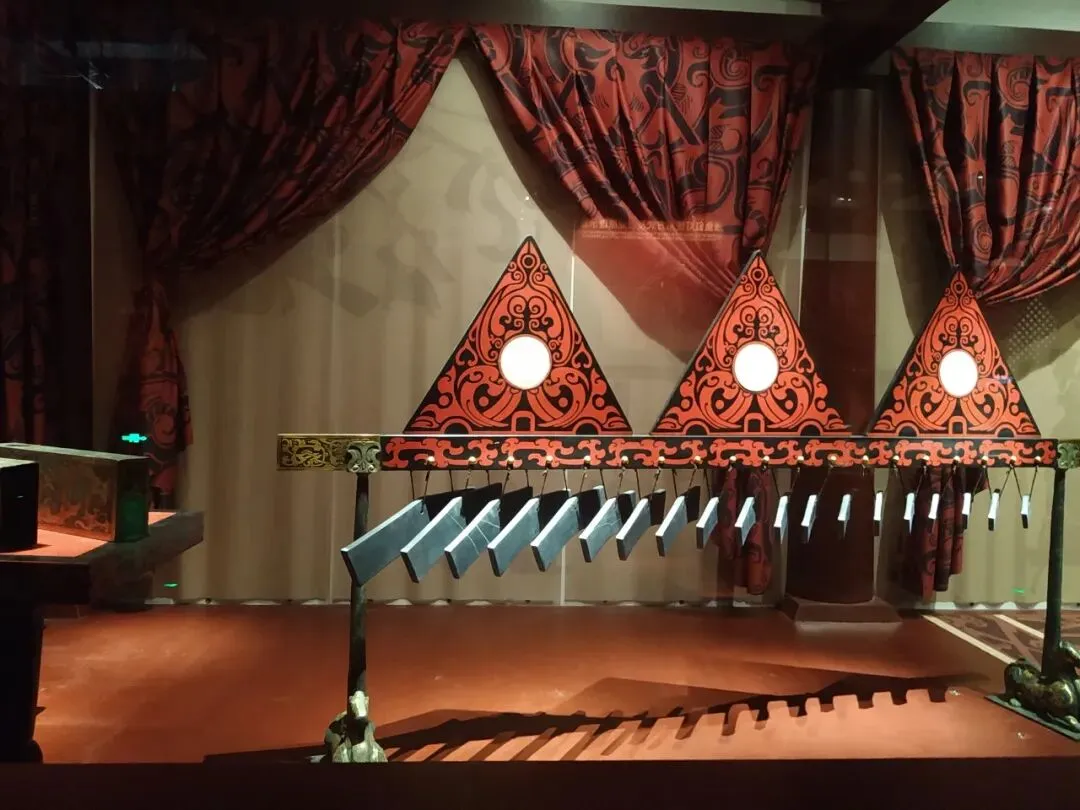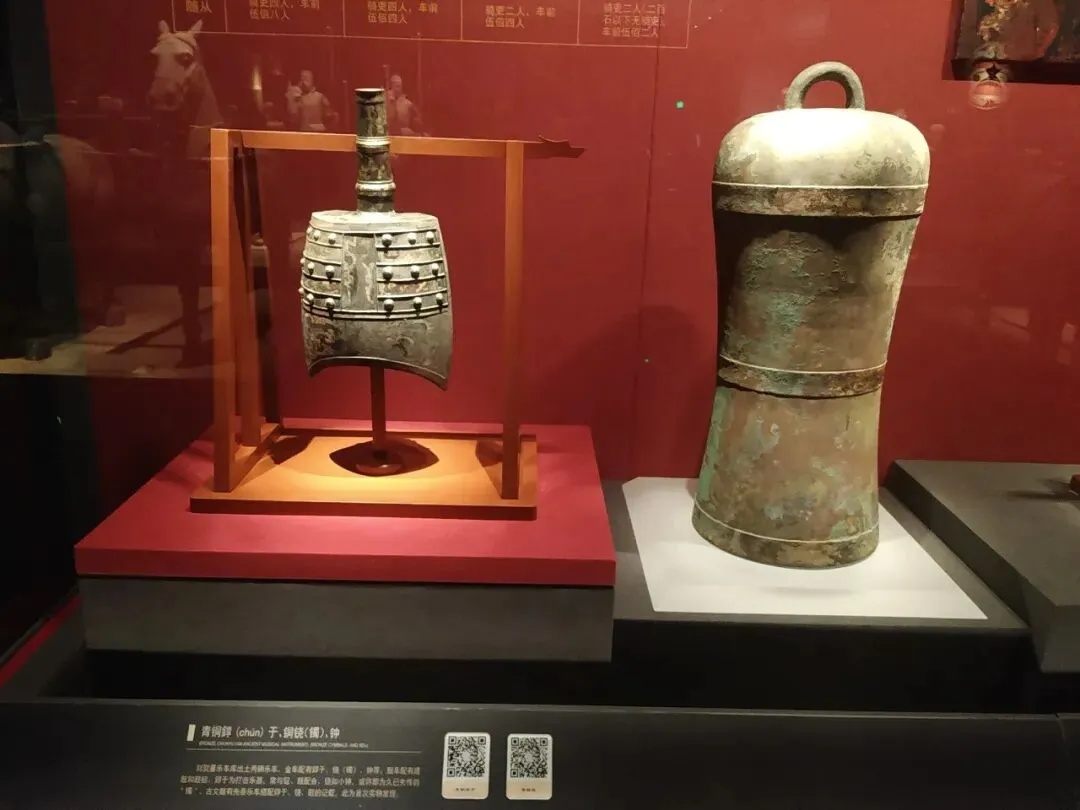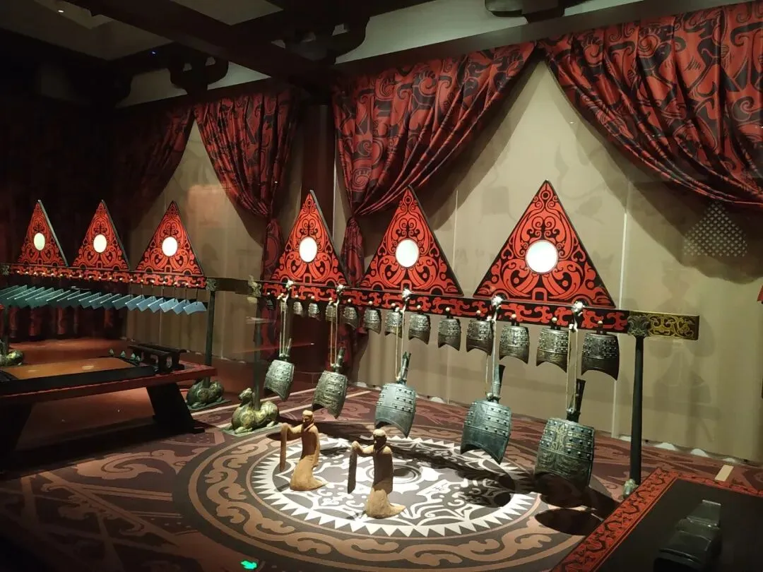 青铜编钟、编磬组合陈列,钟架精美,钟体纹饰繁复,符合《周礼》“诸侯轩悬”的用乐制度,搭配琴、瑟、排箫等乐器与乐俑,再现西汉列侯“钟磬齐鸣、琴瑟和鸣”的雅宴场景。