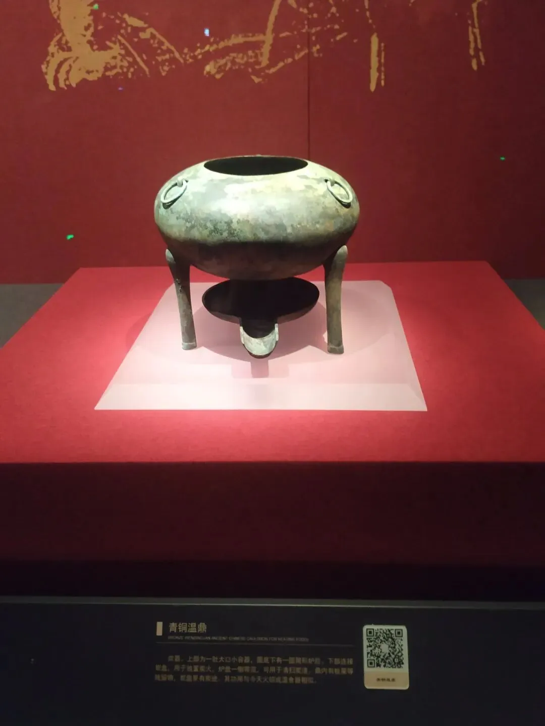 青铜火锅分上下两层,中间置炭,可涮煮食物,形制与现代火锅高度相似,证明汉代贵族已流行火锅饮食。