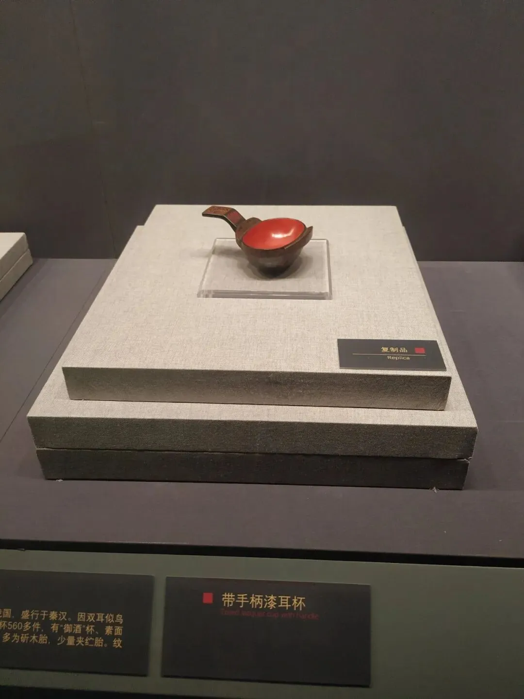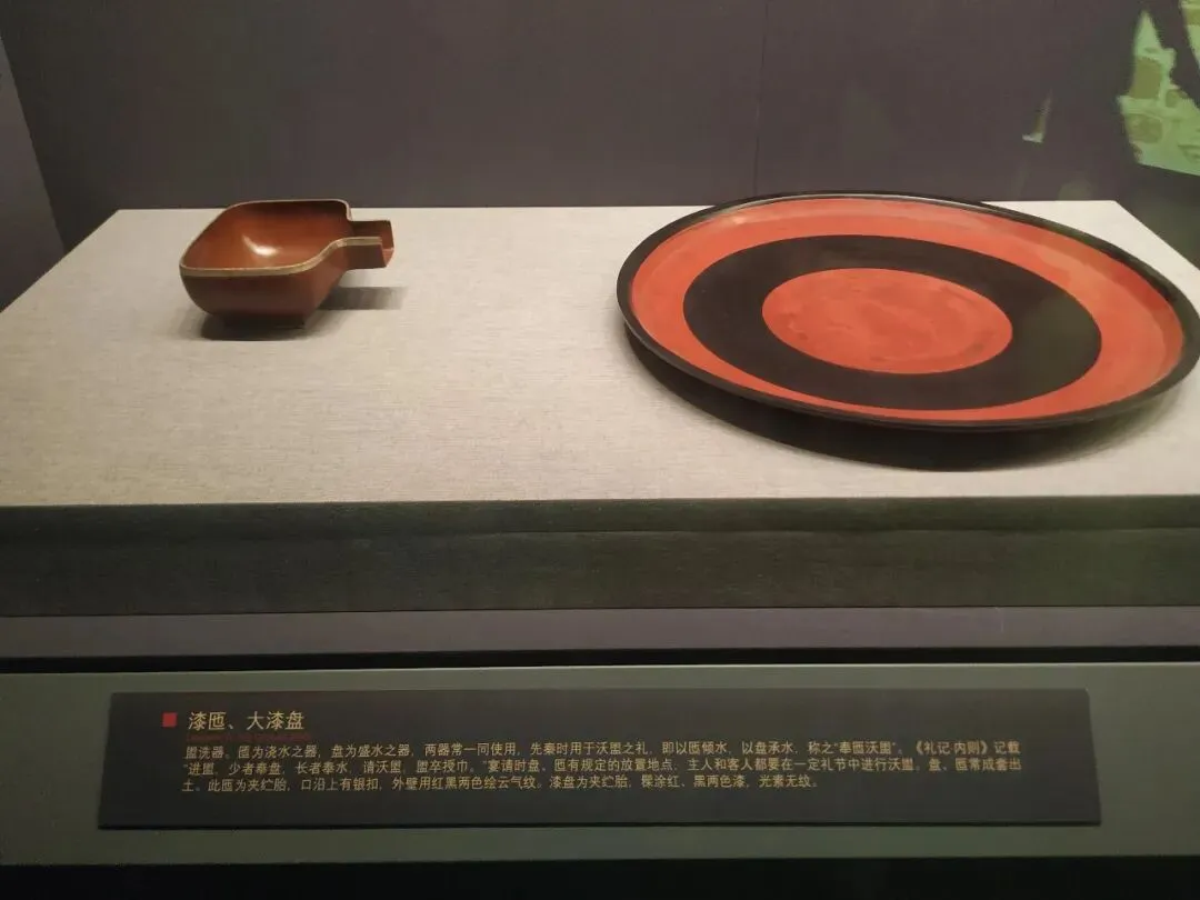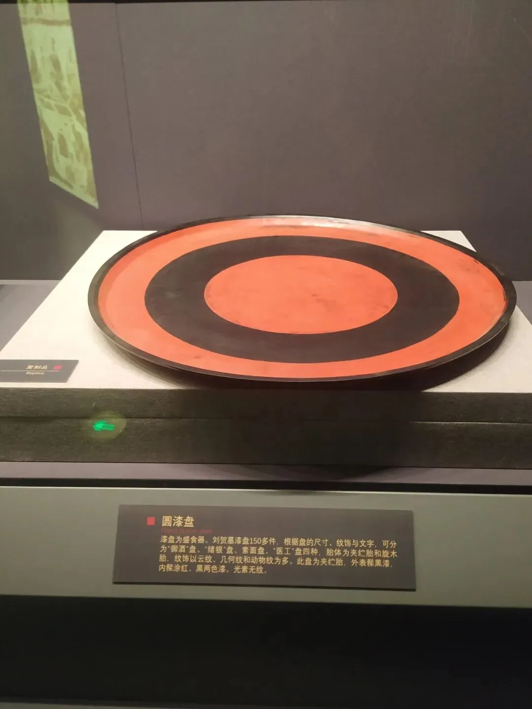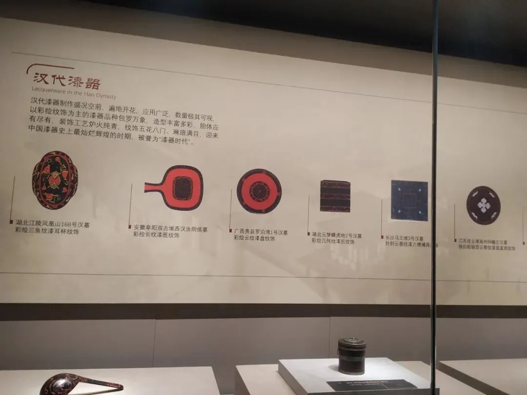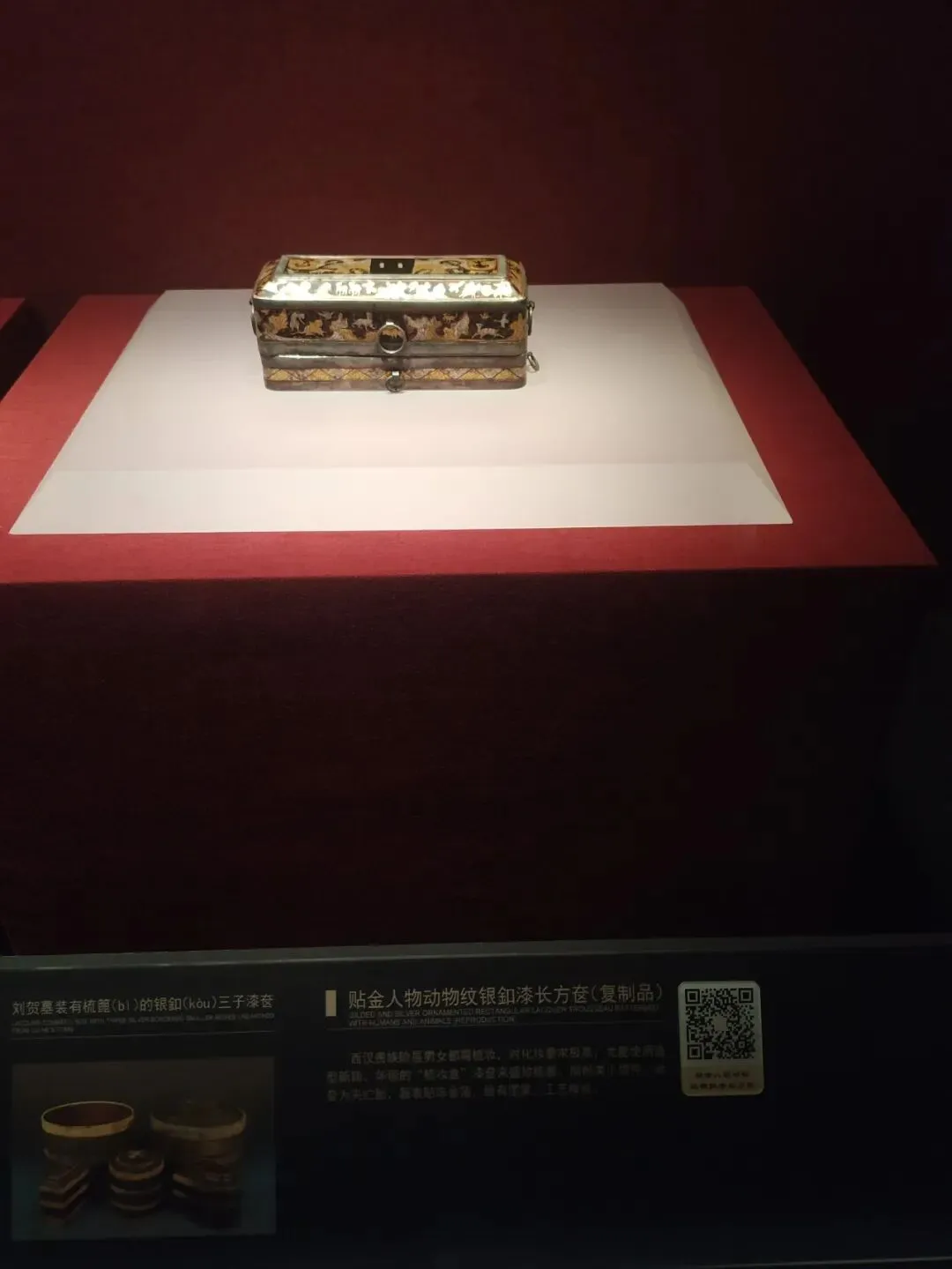 “丹漆海昏”展厅,3000余件漆木器惊艳亮相,汉代漆器“黑红为主、纹饰华美”的特色尽显无遗。汉代漆器工艺精湛,造价昂贵,“一杯漆器,百人之力”,是贵族身份的象征。贴金人物动物纹漆筒通体贴金,以金银箔构成云纹、神兽、人物图案,层次丰富、富丽堂皇。“李具”耳杯小巧精致,杯心朱书“李具”二字,是海昏侯夫人的专用酒具,漆质温润、字迹清晰,尽显汉代贵族生活的精致细节。漆案、漆盘、漆奁等生活用器,造型规整,纹饰精美,采用夹纻、戗金、贴金等工艺,耐腐耐磨,历经千年依旧完好如初,是汉代手工技艺的杰出代表。