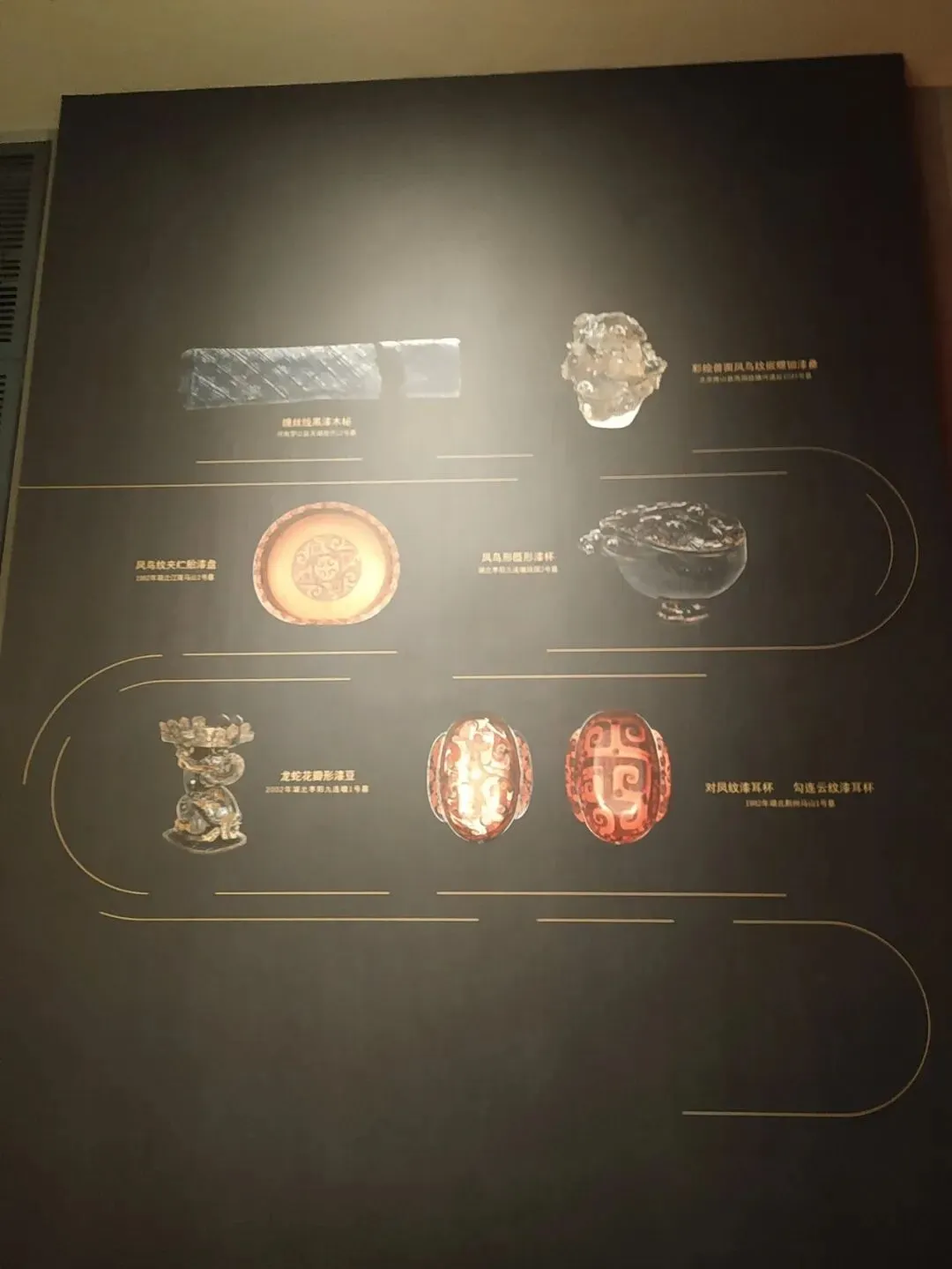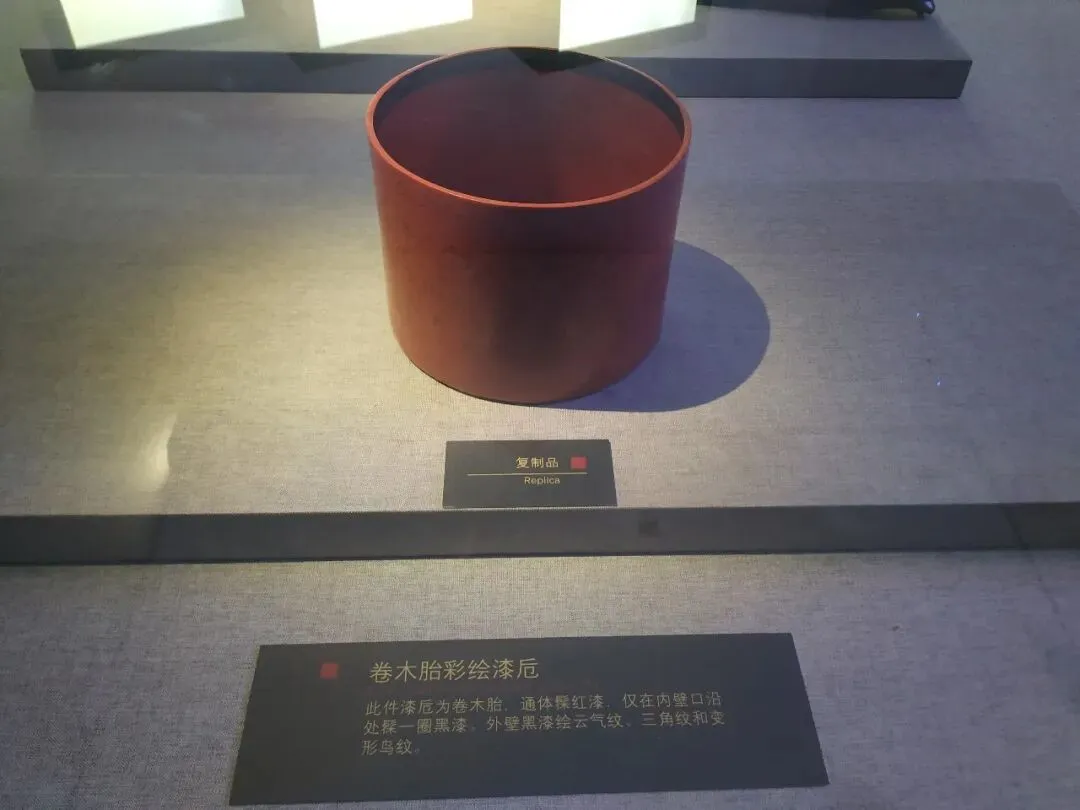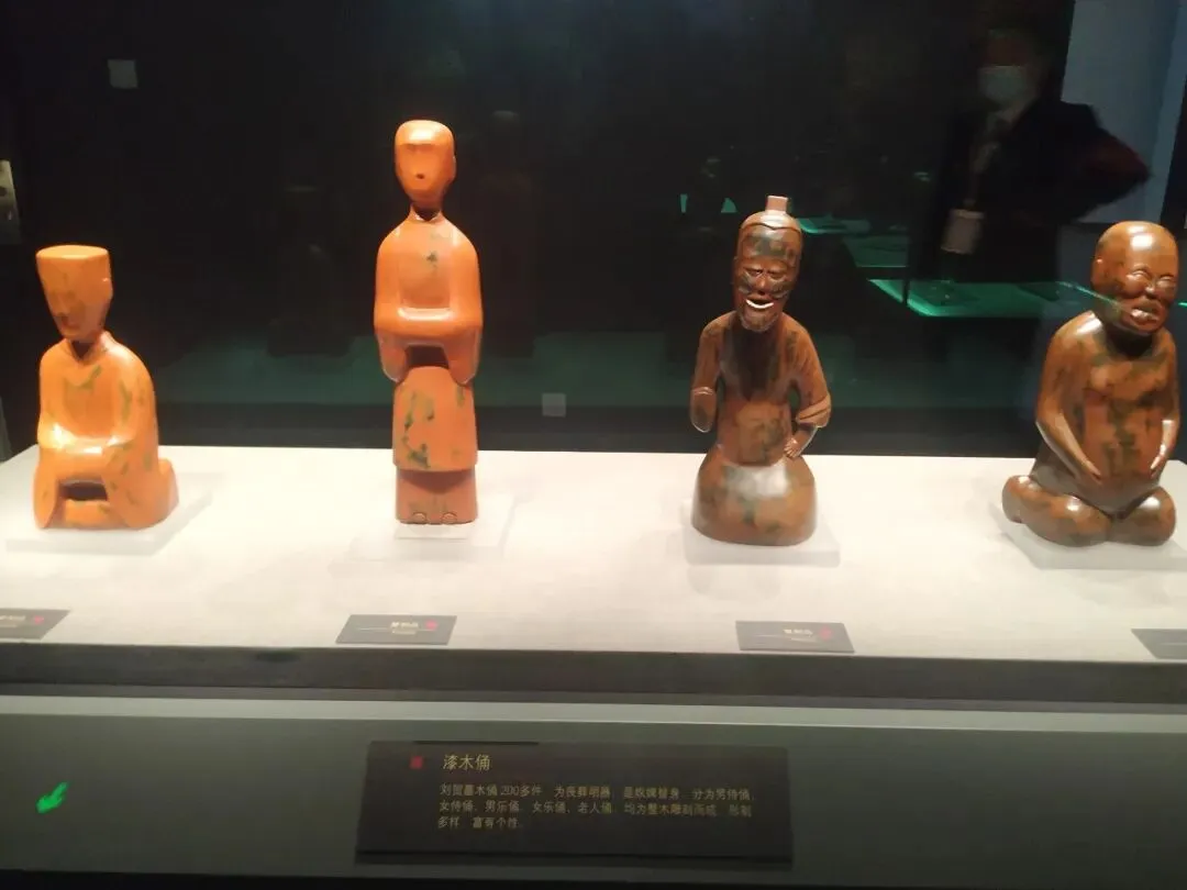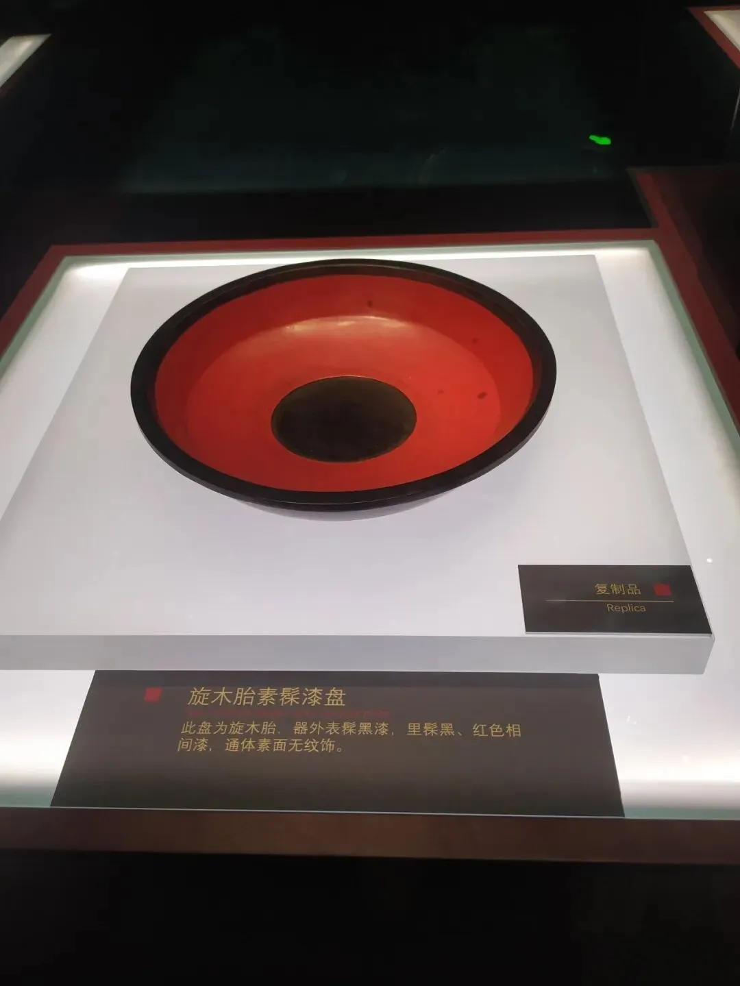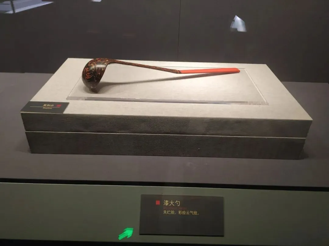 “丹漆海昏”展厅,3000余件漆木器惊艳亮相,汉代漆器“黑红为主、纹饰华美”的特色尽显无遗。汉代漆器工艺精湛,造价昂贵,“一杯漆器,百人之力”,是贵族身份的象征。贴金人物动物纹漆筒通体贴金,以金银箔构成云纹、神兽、人物图案,层次丰富、富丽堂皇。“李具”耳杯小巧精致,杯心朱书“李具”二字,是海昏侯夫人的专用酒具,漆质温润、字迹清晰,尽显汉代贵族生活的精致细节。漆案、漆盘、漆奁等生活用器,造型规整,纹饰精美,采用夹纻、戗金、贴金等工艺,耐腐耐磨,历经千年依旧完好如初,是汉代手工技艺的杰出代表。