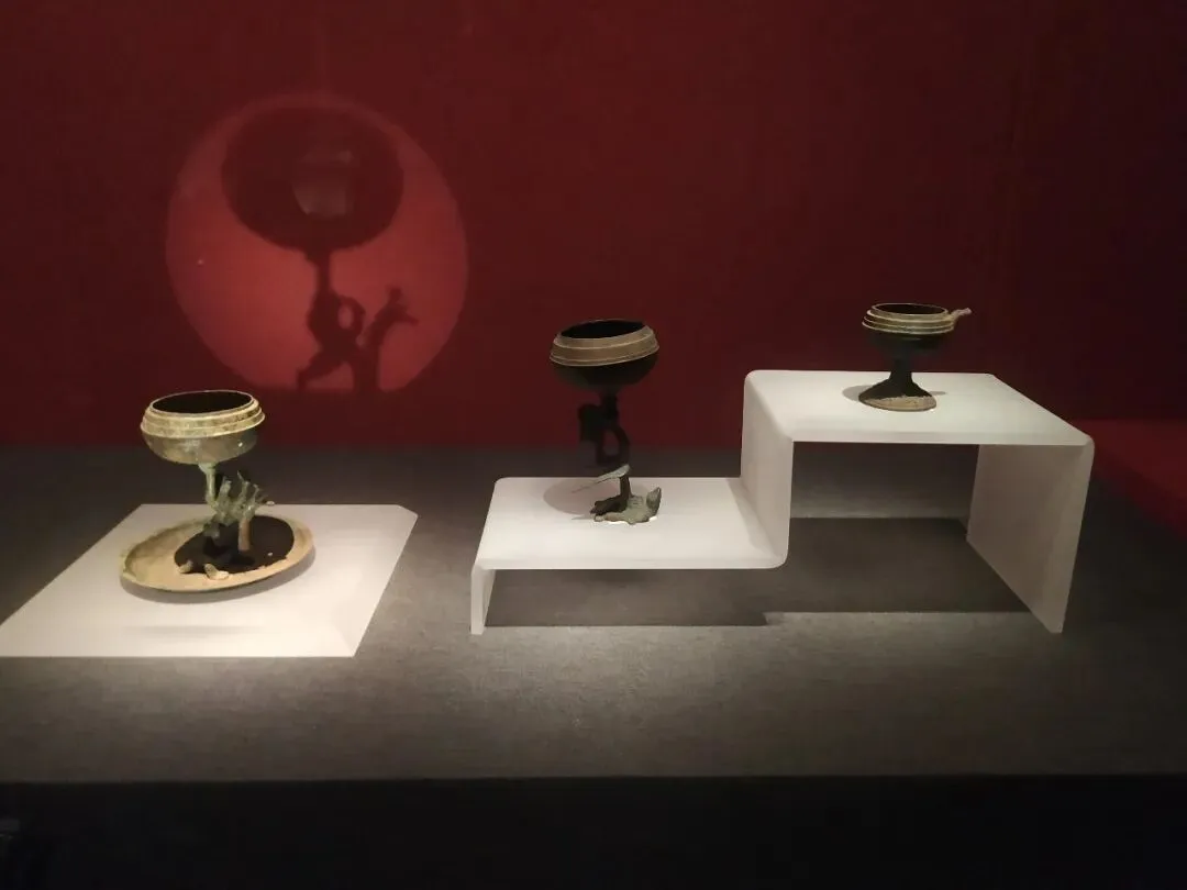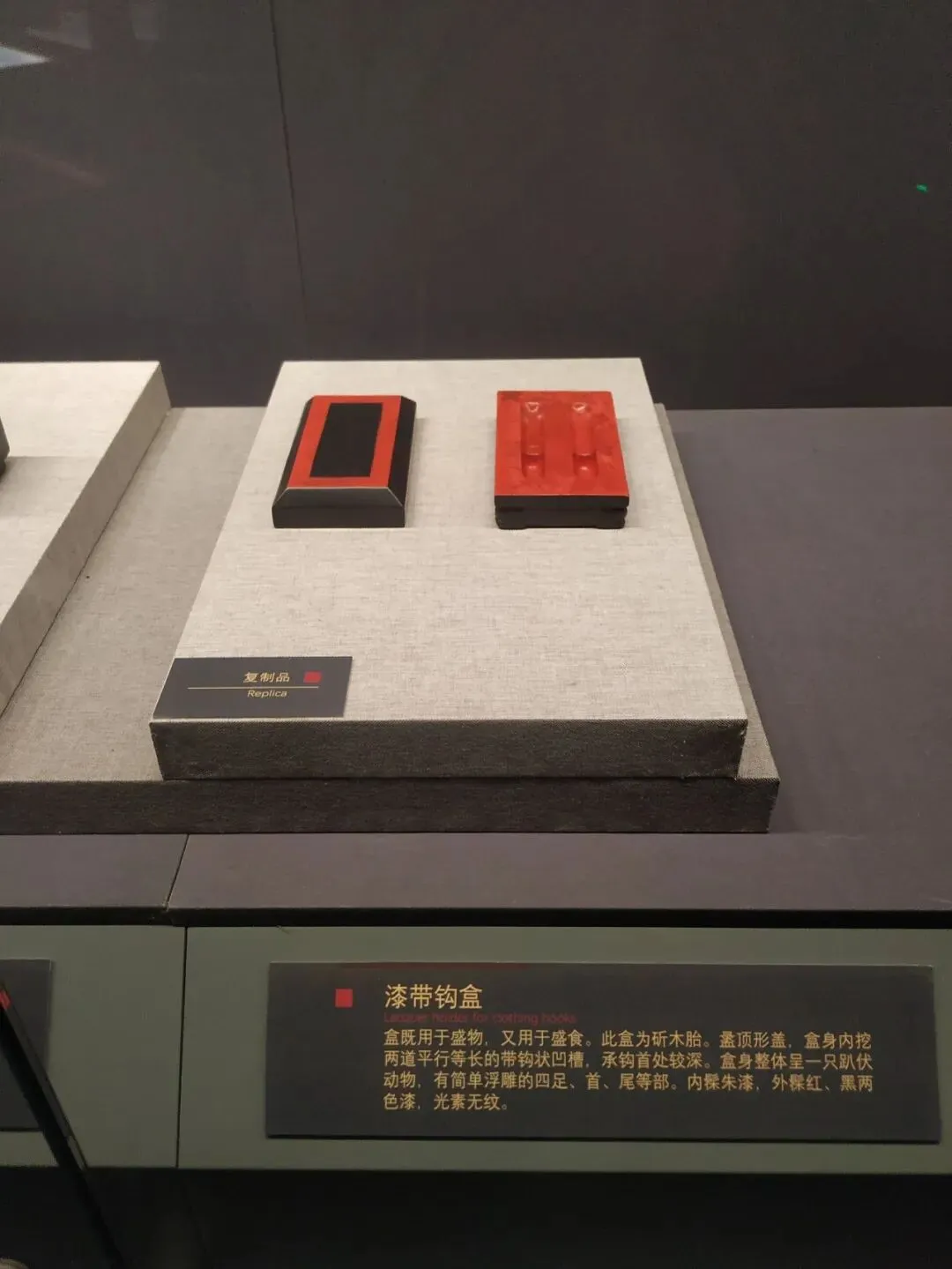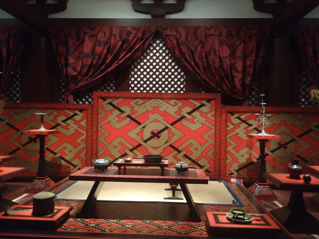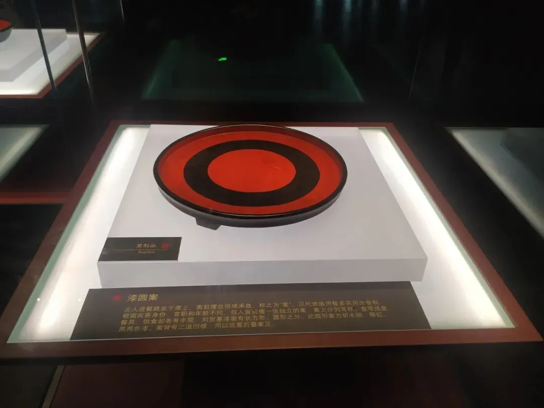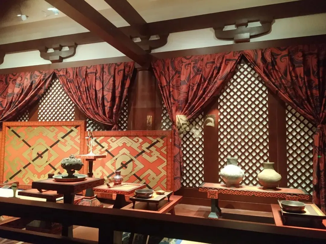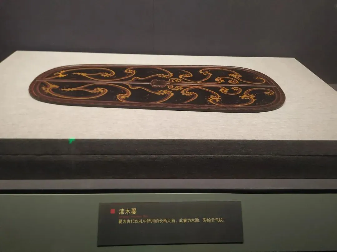 “丹漆海昏”展厅,3000余件漆木器惊艳亮相,汉代漆器“黑红为主、纹饰华美”的特色尽显无遗。汉代漆器工艺精湛,造价昂贵,“一杯漆器,百人之力”,是贵族身份的象征。贴金人物动物纹漆筒通体贴金,以金银箔构成云纹、神兽、人物图案,层次丰富、富丽堂皇。“李具”耳杯小巧精致,杯心朱书“李具”二字,是海昏侯夫人的专用酒具,漆质温润、字迹清晰,尽显汉代贵族生活的精致细节。漆案、漆盘、漆奁等生活用器,造型规整,纹饰精美,采用夹纻、戗金、贴金等工艺,耐腐耐磨,历经千年依旧完好如初,是汉代手工技艺的杰出代表。