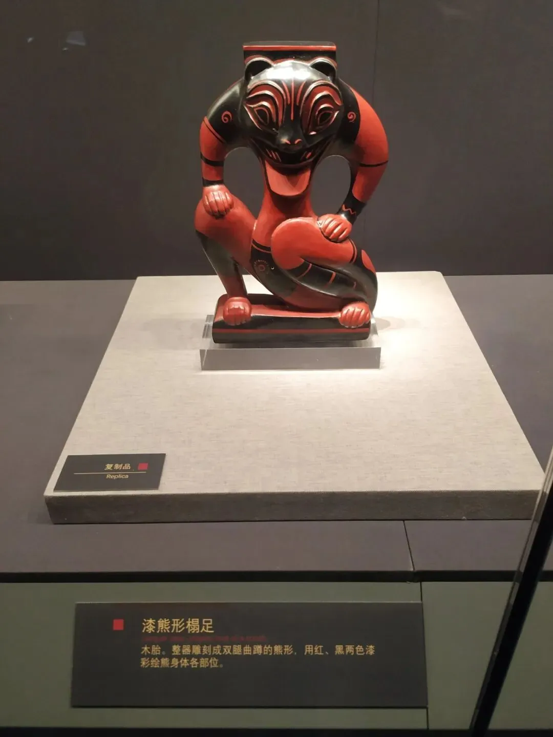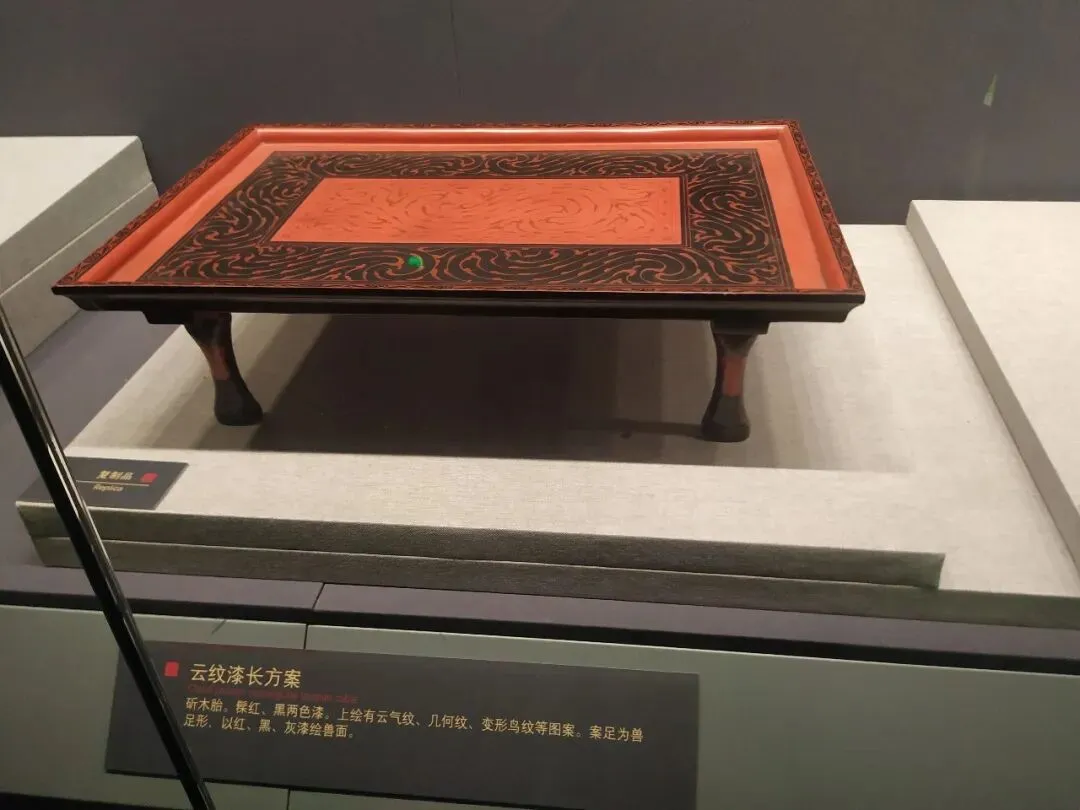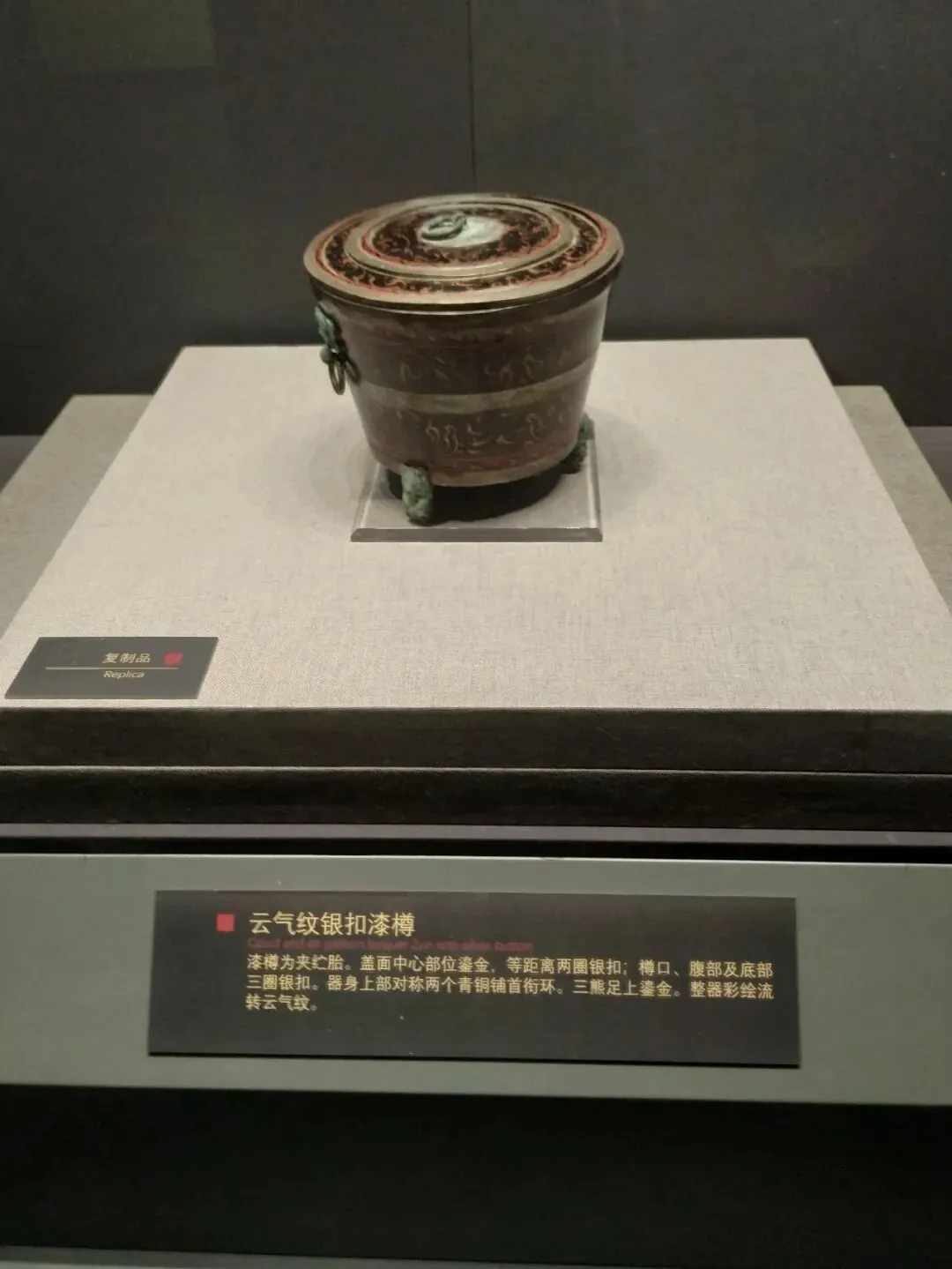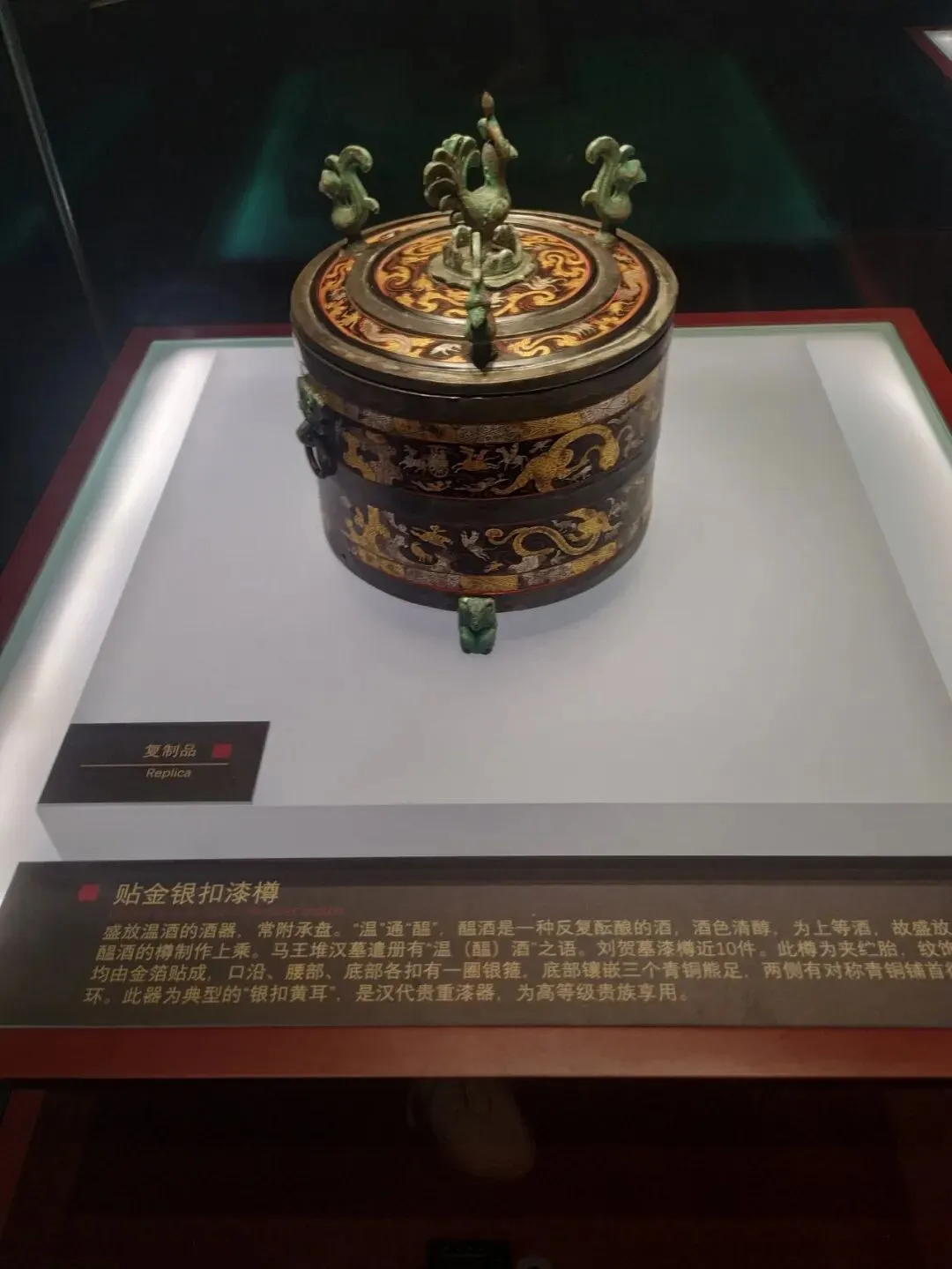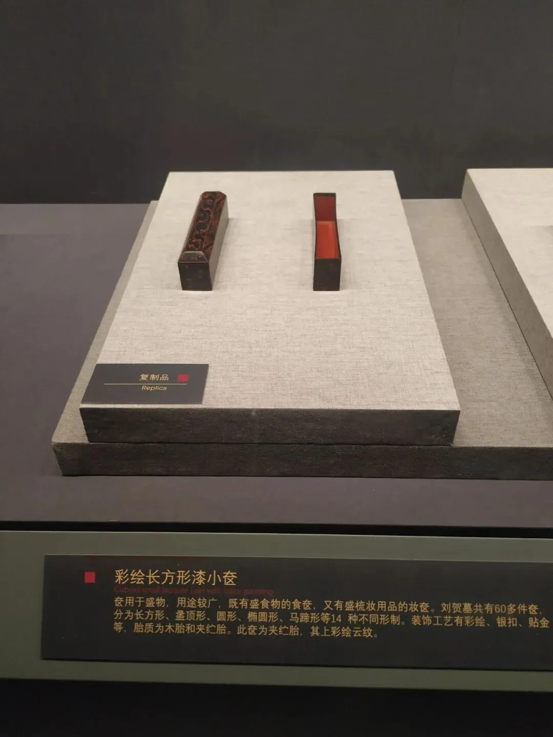 “丹漆海昏”展厅,3000余件漆木器惊艳亮相,汉代漆器“黑红为主、纹饰华美”的特色尽显无遗。汉代漆器工艺精湛,造价昂贵,“一杯漆器,百人之力”,是贵族身份的象征。贴金人物动物纹漆筒通体贴金,以金银箔构成云纹、神兽、人物图案,层次丰富、富丽堂皇。“李具”耳杯小巧精致,杯心朱书“李具”二字,是海昏侯夫人的专用酒具,漆质温润、字迹清晰,尽显汉代贵族生活的精致细节。漆案、漆盘、漆奁等生活用器,造型规整,纹饰精美,采用夹纻、戗金、贴金等工艺,耐腐耐磨,历经千年依旧完好如初,是汉代手工技艺的杰出代表。