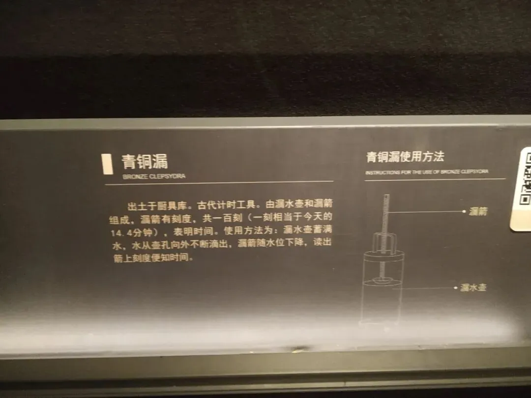 铜漏壶是古代一种极为重要的计时器具。海昏侯墓园1号主墓的酒具库内出土了一把计时用为铜漏壶。这是迄今为止我国发现的第六把滴漏报时铜漏壶,也是在江西首次发现。古人注意漏水容器水面下降的高低和时间有一定对应关系,从而制成了专门用于计时的漏水壶。文献关资料记载显示,汉代刻漏分昼漏与夜漏,共一百刻(一刻等于14.4分)。