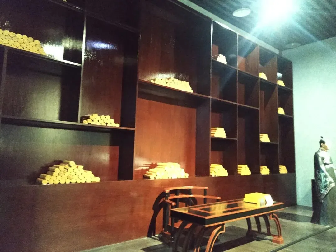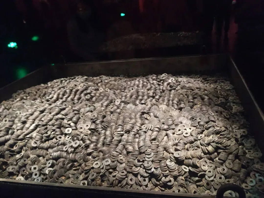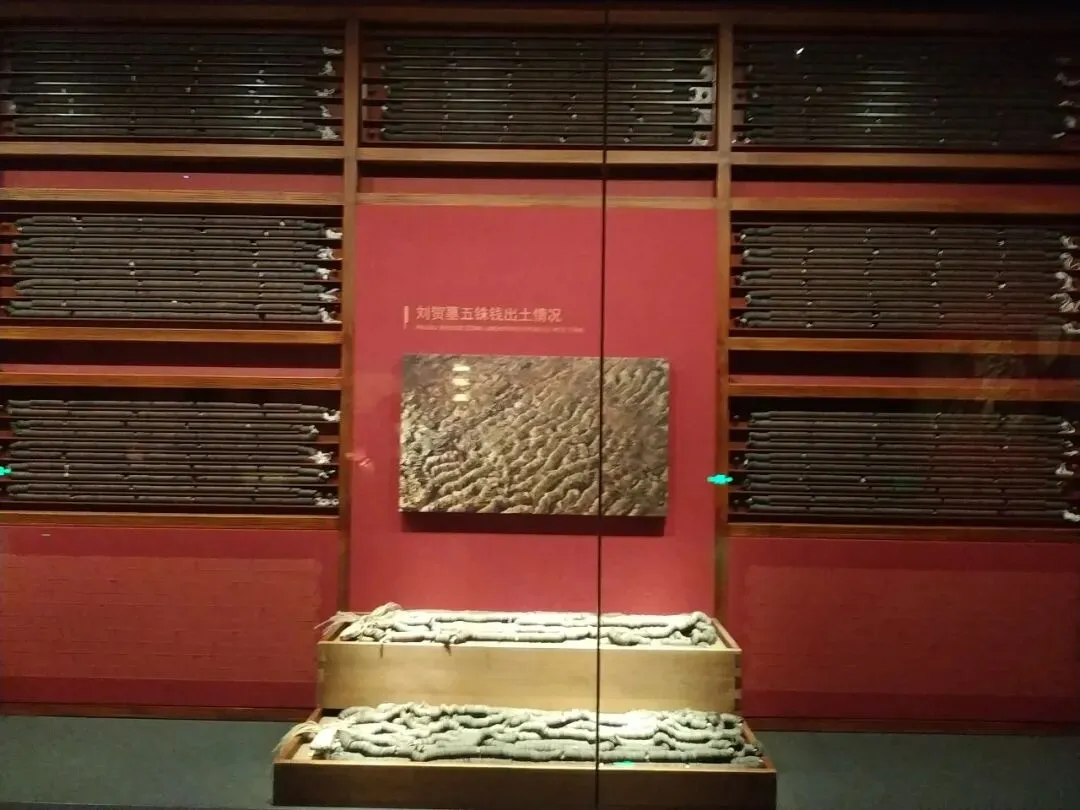 五铢钱窖藏复原景观令人惊叹。墓中出土五铢钱约200万枚,重达10余吨,跨越武、昭、宣三朝,以绳索串系、分层堆放,复原了“钱山”景观,铜钱虽锈迹斑斑,却依旧规整有序。