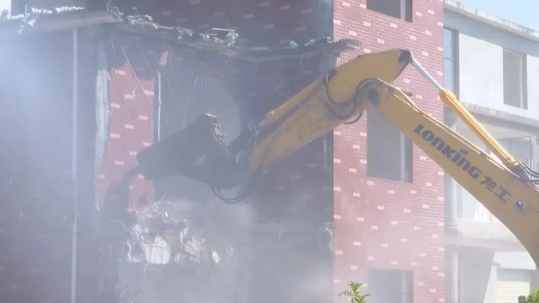 拆迁现场,三台挖掘机伸出巨臂,开足马力作业,被拆房屋的墙体被逐一瓦解,砖块、钢筋等建筑物倾泻而下,洒水车在房子周围进行除尘作业,现场一片繁忙景象。仅仅用了10余分钟,两栋房屋全部拆除完毕。