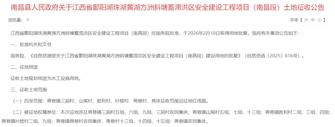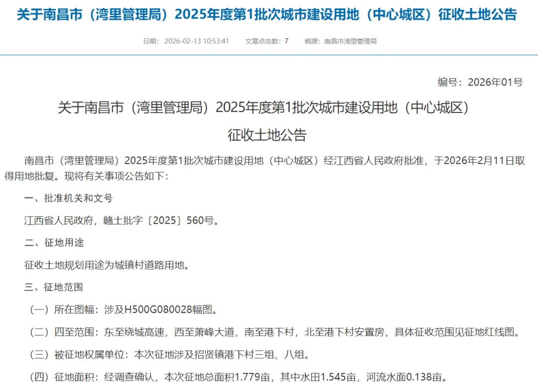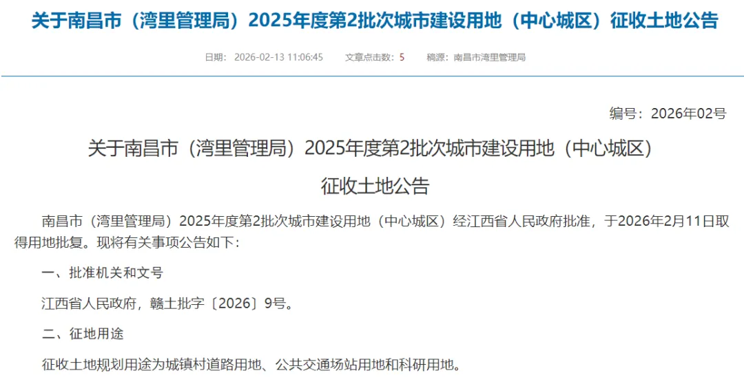 南昌市(湾里管理局)2025年度第2批次城市建设用地(中心城区)经江西省人民政府批准,于2026年2月11日取得用地批复。