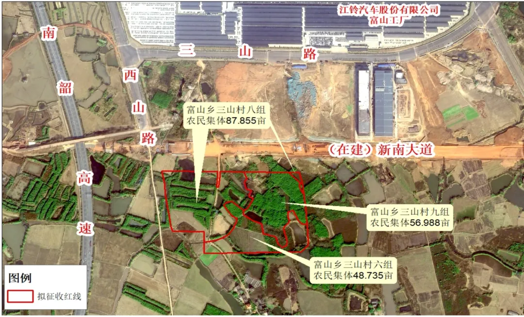 从征地范围来看,主要位于新南大道与西山路交汇处,北部近江铃汽车股份有限公司富山工厂。