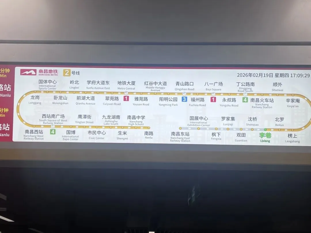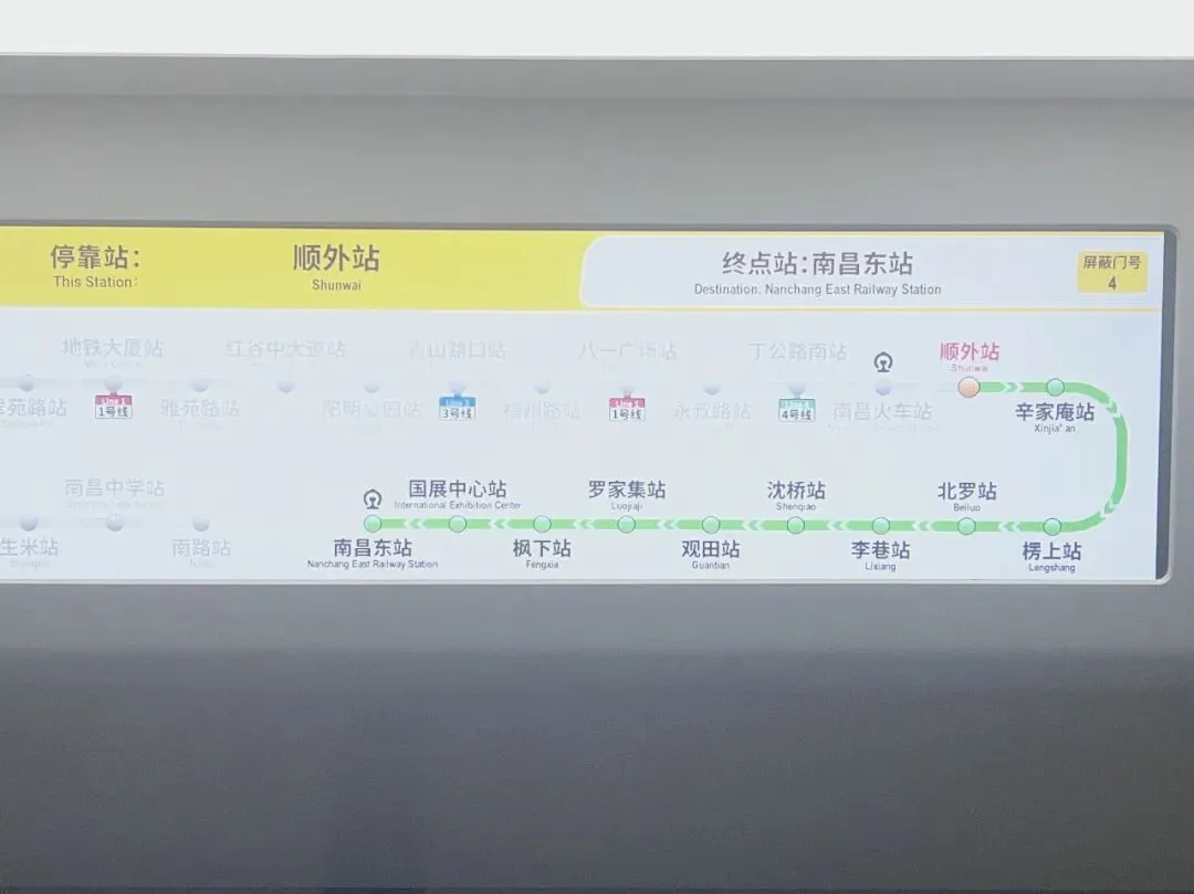 南昌地铁车厢里的站牌显示屏在车门正上方,整个显示屏空间太小了,现在的人刷手机多,视力都不好,坐在座位上根本看不清站名写的是什么字。