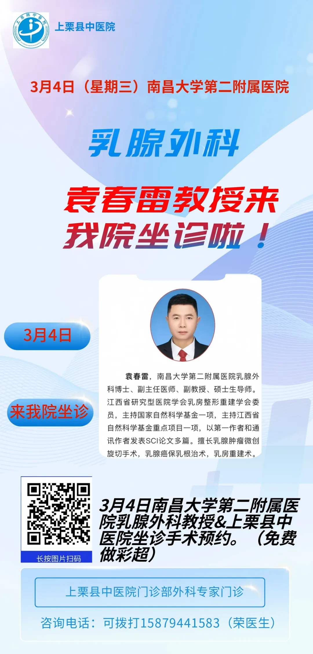 好消息!!! 3月4日(星期三)上栗县中医院特邀南昌大学第二附属医院乳腺外科专家袁春雷教授来院坐诊,手术。请提前预约!