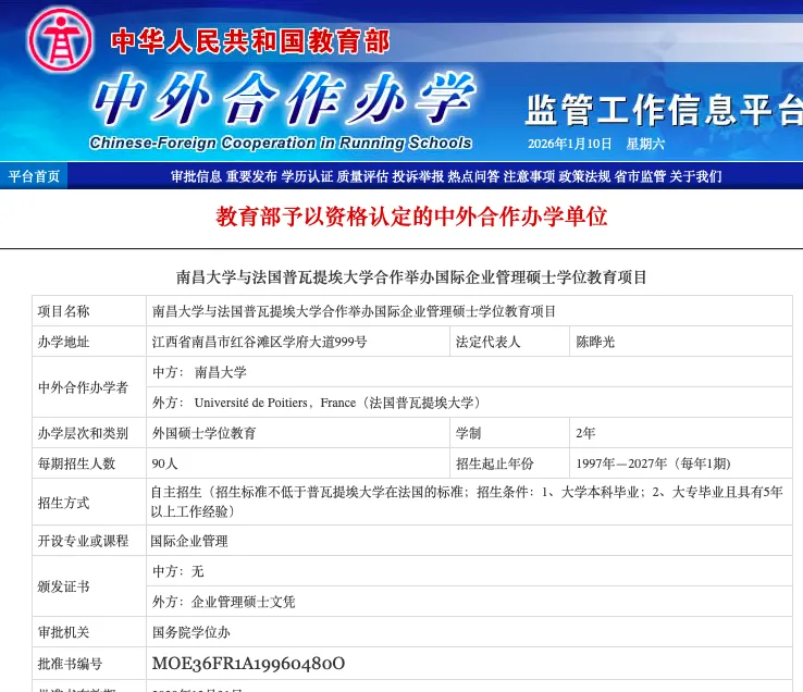 1997年,教育部批准南昌大学与法国普瓦提埃大学(Université de Poitiers)合作开展“企业管理硕士”学位教育项目,2013年获准变更为“国际企业管理硕士”。2024年,经中法双方充分讨论,决定在现有国际企业管理硕士专业基础上,增设“碳中和与可持续发展”班级方向,旨在培养具备可持续发展战略思维的国际化管理精英,授予法国普瓦提埃大学相应文凭与学位。2025年5月,该中法合作硕士项目因增设新方向喜获教育部批准,每期招生人数由原来的60人提升至90人。中法双方团队将以此为契机,在二十余载高效、高质量合作的基础上,砥砺前行,为我校的国际化办学、为中法高等教育的合作贡献力量!普瓦提埃大学创立于1431年,是法国及欧洲历史最悠久的著名高等学府之一,现有14所学院,近3000名教师和工作人员,28000余名学生(其中外国留学生约4000名),是一所学科齐全、师资雄厚、设施完善、环境优雅的国立综合性大学,在法国及国际上享有良好的声誉。该校企业管理学院(Institut d’Administration des Entreprises)已有60余年培养企业管理硕士、博士的历史,办学质量在法国同类学院的评估中名列前茅。课程设置