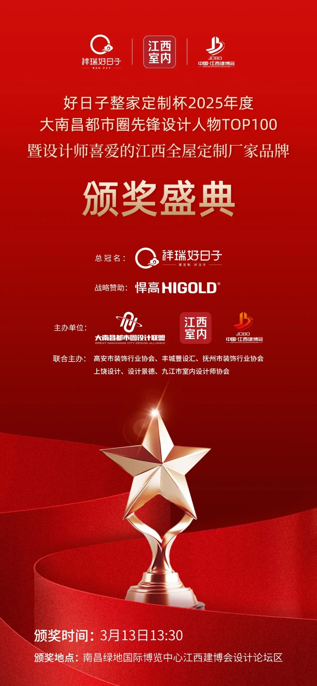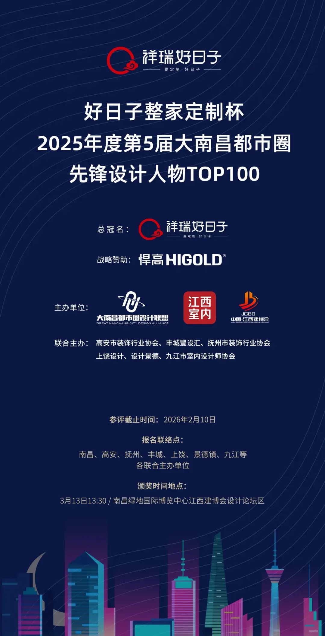 当赣江的浪潮遇见都市圈澎湃的脉动,当个体的才情融入区域共进的洪流,一场关于设计力量的崭新叙事,正在大南昌的辽阔版图上磅礴展开。在双循环发展格局与强省会战略的宏大引擎驱动下,大南昌都市圈正以前所未有的速度,编织经济、文化与人才的密集网络。产业的互动与共赢,从未像今天这般紧要。设计,作为塑造城市美学、提升空间品质、驱动商业价值的关键力量,其融合与协同发展,对于提升整个都市圈的设计水位与产业能级,具有深远的战略意义。2026年3月13日14:00,我们相约江西建博会,由大南昌都市圈设计联盟、江西室内、江西建博会主办,高安市装饰行业协会、丰城豐设汇、抚州市装饰行业协会、上饶设计、设计景德、九江市室内设计师协会联合主办,好日子整家定制总冠名,悍高五金战略赞助的“好日子整家定制杯第5届大南昌都市圈先锋设计人物TOP100颁奖盛典暨设计师喜爱的江西全屋定制厂家品牌”将隆重举行,共同见证第5届的百人榜单。打破地理界限,汇聚设计星光,以城市的维度思考,以设计的力量赋能。本届赛事参评从2025年9月23日开始,到2026年2月10日参报截止,将于2026年3月13下午在江西建博会设计论坛区进行现场揭晓并颁奖。与此同时,与江西建博会、江西室内联合主办的“设计师喜爱的江西全屋定制厂家品牌”也将同时揭榜颁奖,设计论坛等精彩内容,大家敬请期待!作为江西最具影响力的橱柜品牌之一,江西好日子橱柜有限公司始创于1998年,公司自成立以来一直怀揣着"为人们带来美好家居生活"的理念,致力于高品质的橱柜及家居产品的设计和生产。公司设立于风景秀丽的南昌小蓝工业园,占地面积约20000平方米。在过去的几十年里公司不断引入先进的自动化生产设备和顶尖的工艺技术,现已成为江西定制行业的标杆企业。并编撰江西省地方标准《住宅室内装饰装修工程质量验收标准》白皮书。多次获得"中国绿色环保产品""中国驰名品牌""315诚信建设单位""年度影响力家居品牌",并且在2021年获得"国家高新技术企业","江西省精装特新企业"等荣誉。感谢好日子整家定制的再次冠名支持,也欢迎设计师朋友展会期间去祥瑞好日子展位(A2馆T-15)参观指导!悍高集团股份有限公司,创始于2004年,是一家以家居五金为核心,包括功能五金、基础五金、厨卫五金、柜类照明、户外家具于一体的多元化创新型企业,致力于为全球用户打造一站式全屋高端五金解决方案。作为中国家居五金行业高端品牌,品牌知名度及销售规模在国内一直处于领跑地位。2025年7月30日,悍高集团成功A股上市,铸就“中国功能五金第一股”里程碑,开启资本市场新征程。