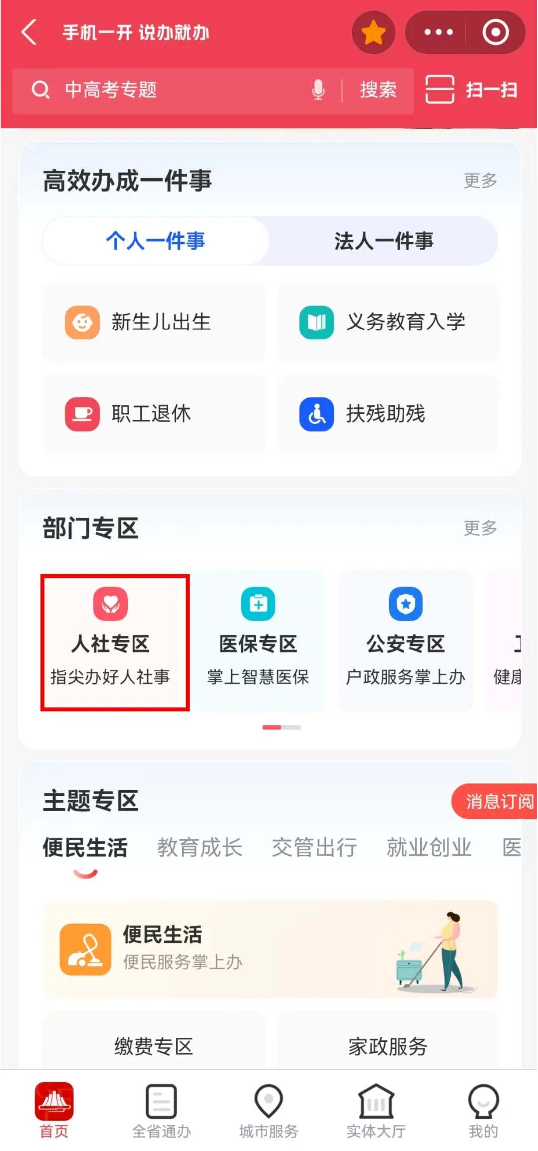 ◆在支付宝上搜索赣服通,进入页面之后下滑在“部门专区”找到“人社专区”